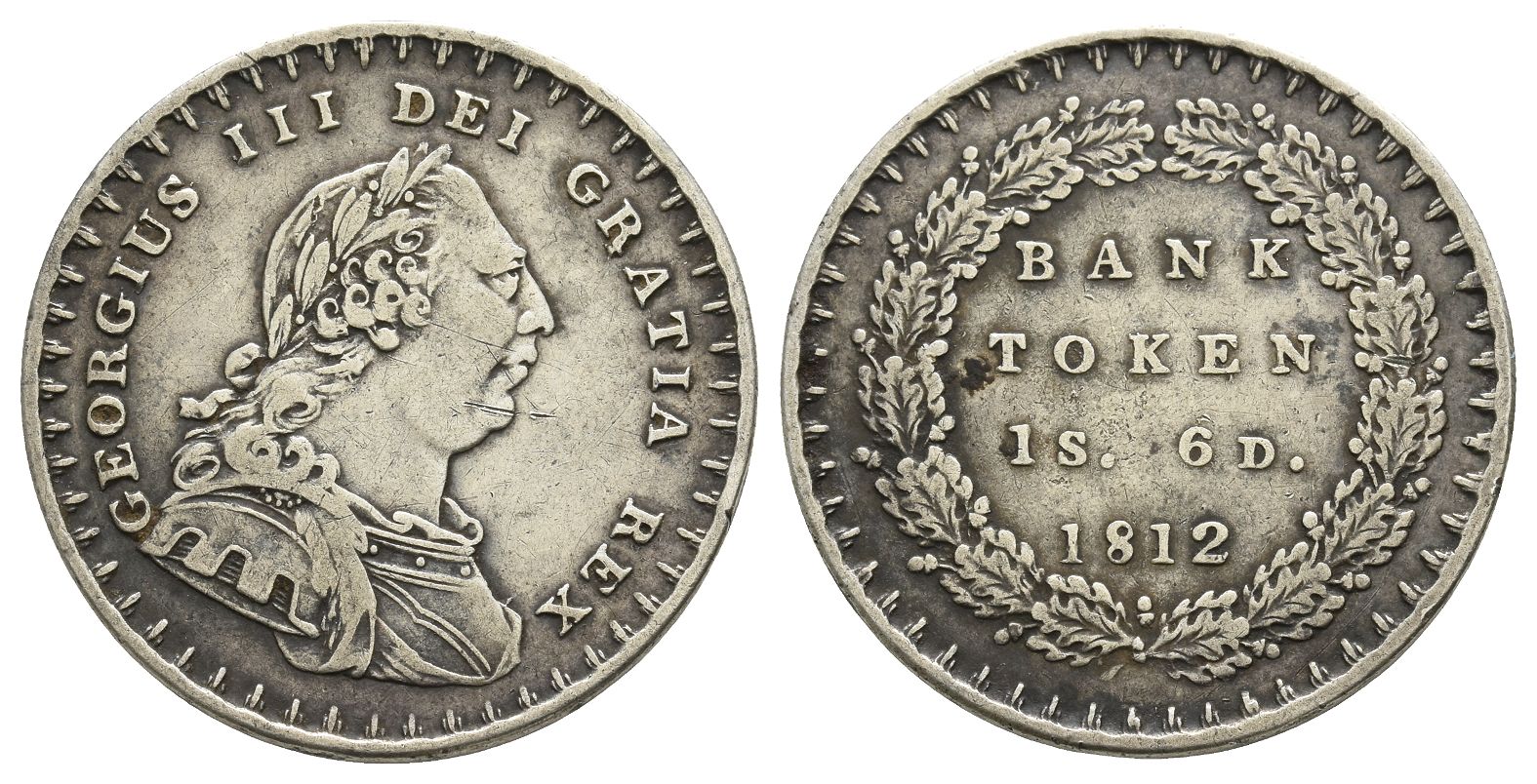 GEORGIUS III DEI GRATIA REX, laureate and cuirassed bust to right / BANK TOKEN 1 S. 6 D. 1812 in four lines, within oak wreath. SCBC 3771. 7.23gr, 26mm, 12h.