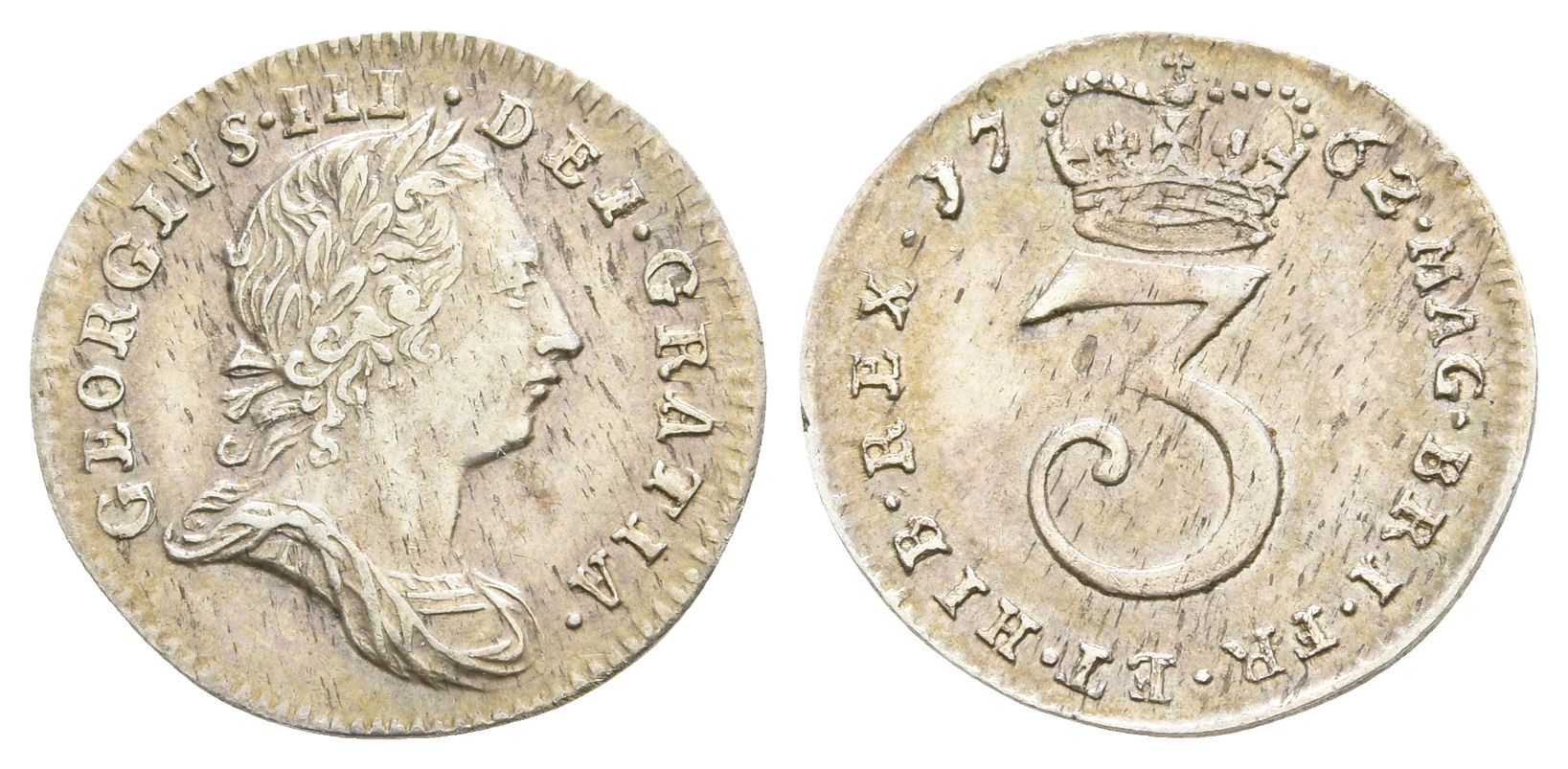 GEORGIVS • III • DEI • GRATIA •, laureate and draped bust to right / MAG • BRI • FR • ET • HIB • REX •, large crowned 3; date above. SCBC 3753. 1.50gr, 18mm, 6h.