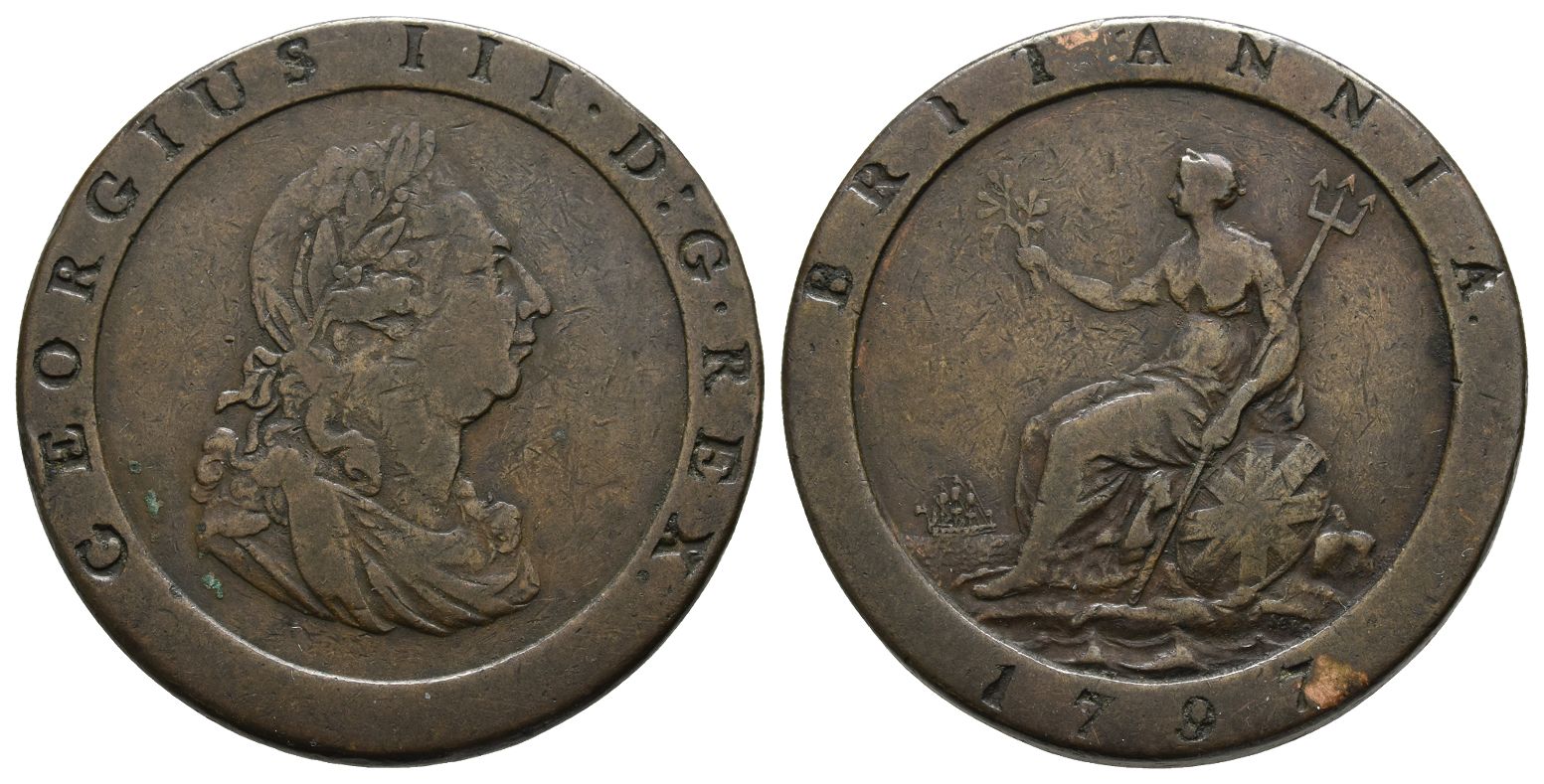 Soho (Birmingham) mint. Dated 1797. Design by Conrad Heinrich Küchler. "Cartwheel" type. GEORGIUS III • D : G • REX., laureate and draped bust to right / BRITANNIA., Britannia seated to left on rocks surrounded by waves, holding trident in left hand and olive branch in right, shield bearing the Union flag resting to right, SOHO (mintmark) on raised tablet below shield, ship sailing to right on horizon; date below. SCBC 3777. 28.67gr, 36mm, 6h.
