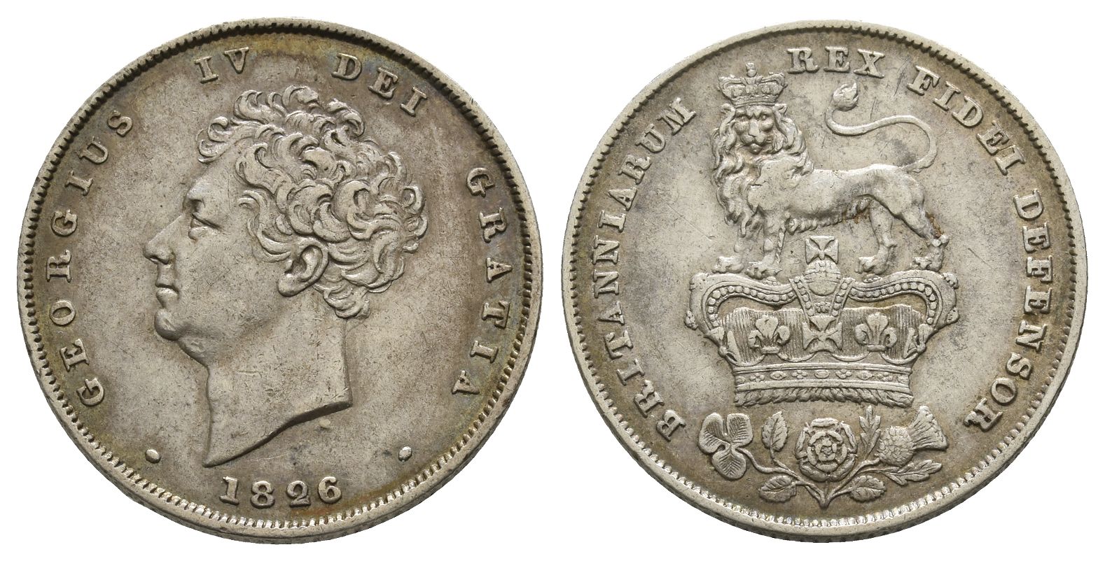 Royal mint. Dated 1826. Designs by Jean Baptiste Merlen. GEORGIUS IV DEI GRATIA, bare head to left; date below / BRITANNIARUM REX FIDEI DEFENSOR, crowned lion standing on St Edward's crown; floral emblems below. SCBC 3812. 5.57gr, 23mm, 6h.