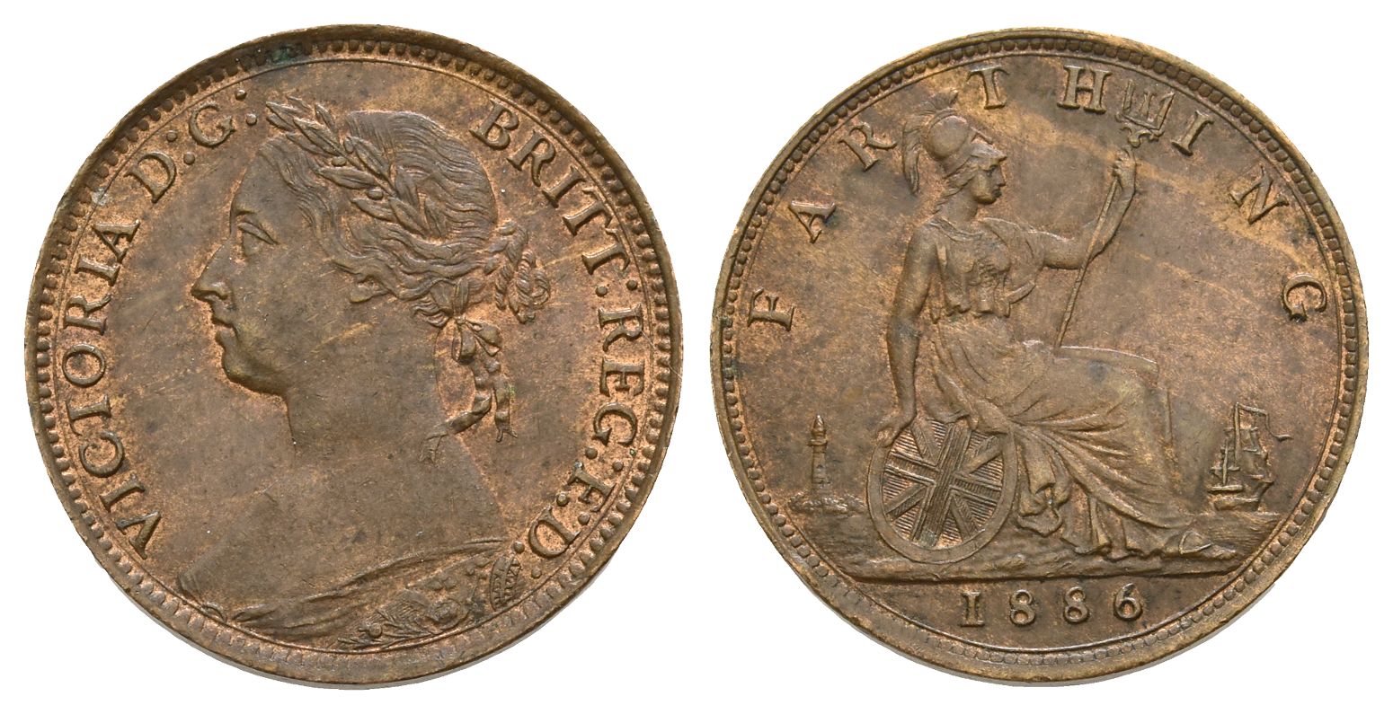 London mint. Dated 1886. 'Bun Head' issue. VICTORIA D : G : BRITT : REG : F : D :, laureate bust to left / FARTHING, Britannia seated to right, holding trident in left hand, and shield with Union flag in right hand, date in exergue; sea behind with lighthouse on left and ship on right. Freeman 557; SCBC 3958. 2.81gr, 20mm, 12h.