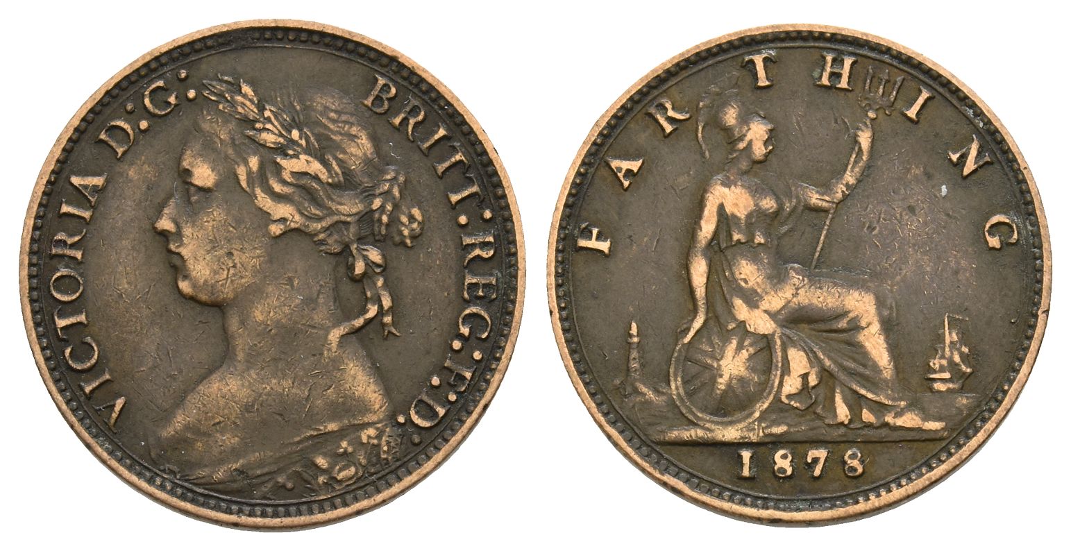 London mint. Dated 1878. 'Bun Head' issue. VICTORIA D : G : BRITT : REG : F : D :, laureate bust to left / FARTHING, Britannia seated to right, holding trident in left hand, and shield with Union flag in right hand, date in exergue; sea behind with lighthouse on left and ship on right. Freeman 536; SCBC 3958. 2.80gr, 20mm, 12h.