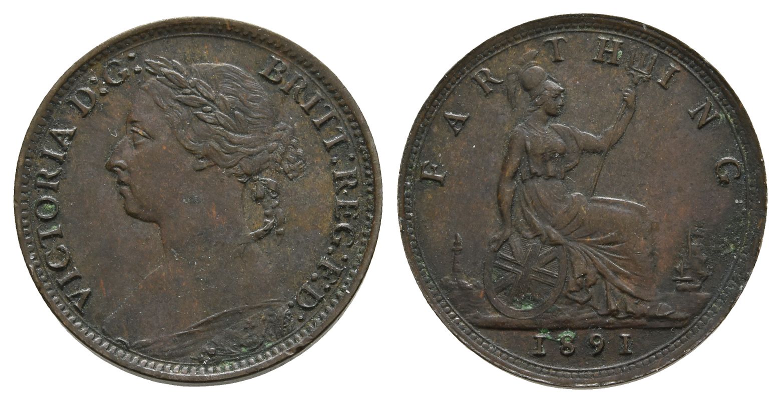 London mint. Dated 1891. 'Bun Head' type. VICTORIA D: G: BRITT: REG: F: D:, laureate and draped bust to left / FARTH-ING, seated figure of Britannia to right, trident in left hand, shield with Union flag in right hand, date in exergue; sea behind with lighthouse on left and ship on right. Freeman 564; SCBC 3958. 2.95gr, 20mm, 12h.