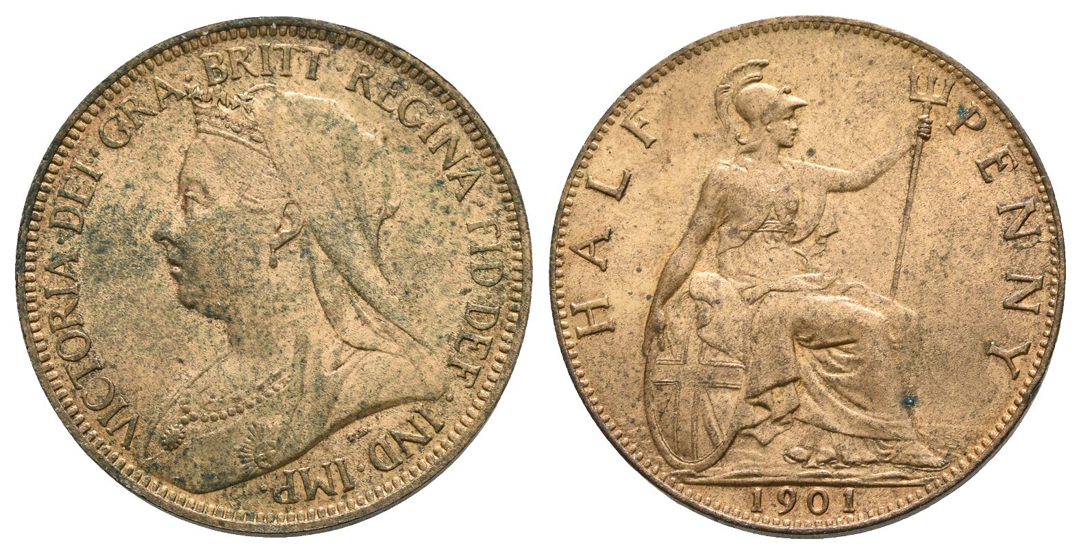 London mint. Dated 1901. 'Old Head' type. VICTORIA • DEI • GRA • BRITT • REGINA • FID • DEF • IND • IMP •, crowned and draped bust to left / HALF PENNY, Britannia seated to right on rocks, holding shield and trident, sea in background, date in exergue. SCBC 3962. 5.74gr, 25mm, 12h.