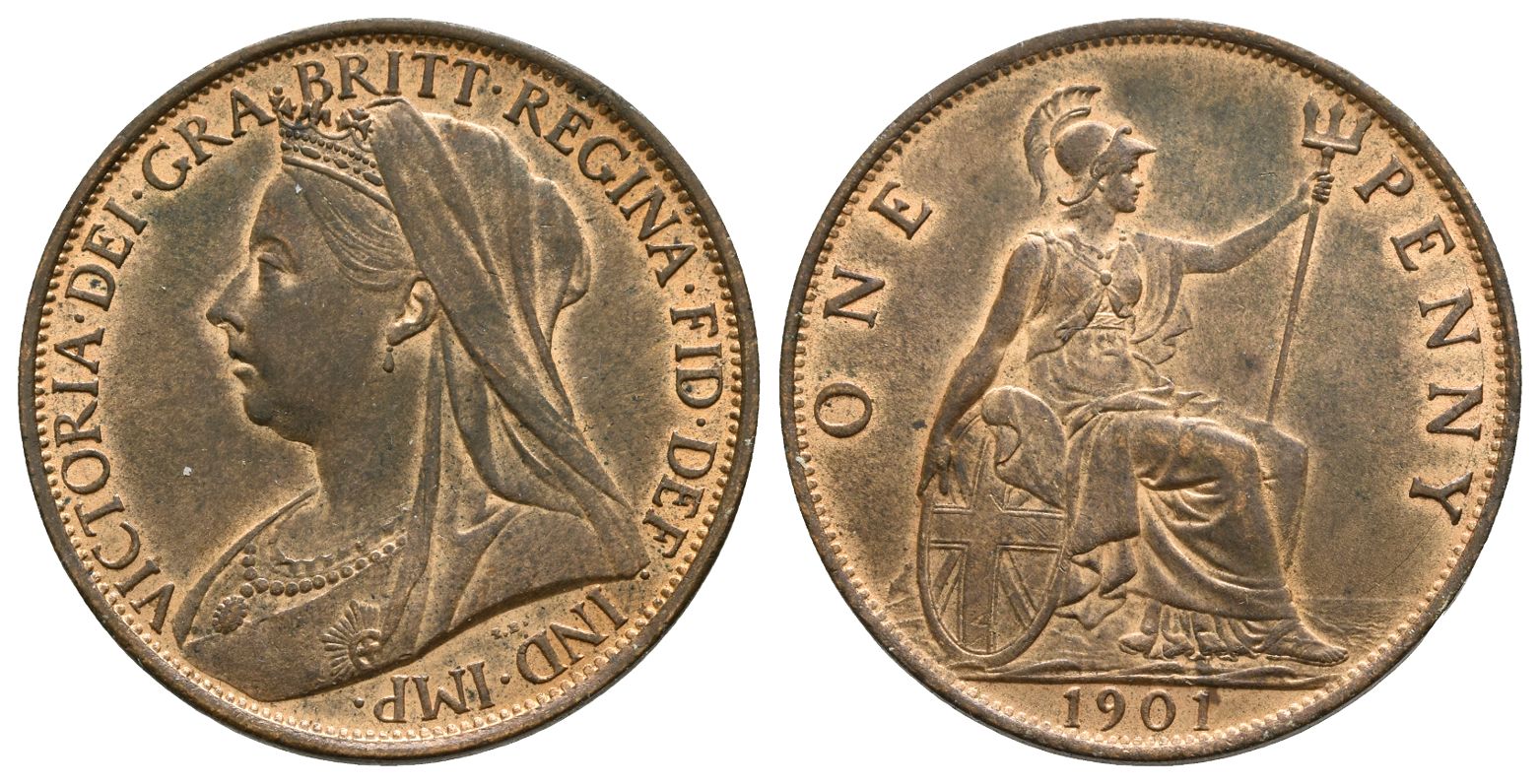 London mint. Dated 1901. Old Head type. Designs by Sir Thomas Brock and Leonard Charles Wyon. VICTORIA • DEI • GRA • BRITT • REGINA • FID • DEF • IND • IMP •, older diademed and veiled bust to left; T.B. in small lettering beneath truncation / ONE PENNY, Britannia seated to right, holding trident in left hand and shield bearing the Union flag in right, sea behind; date in exergue. SCBC 3961. 9.47gr, 30mm, 12h.