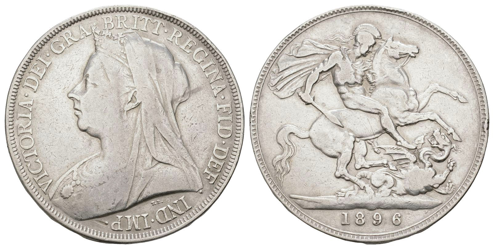 London mint. Dated RY LX and 1896. Old Head coinage. Designs by Thomas Brock and Benedetto Pistrucci. VICTORIA • DEI • GRA • BRITT • REGINA • FID • DEF • IND • IMP •, crowned, veiled and draped bust to left; T.B. in small lettering beneath truncation / St. George on horseback to right, holding sword with right hand and wearing plumed helmet and billowing cloak, slaying the dragon which falls to right; small B. P. below ground line to right, date in exergue. Edge inscription: DECUS ET TUTAMEN ★ ANNO REGNI LX ★. SCBC 3937; KM 783; ESC 6th 2599 (old 309); BSC 517. 27.99gr, 38mm, 11h