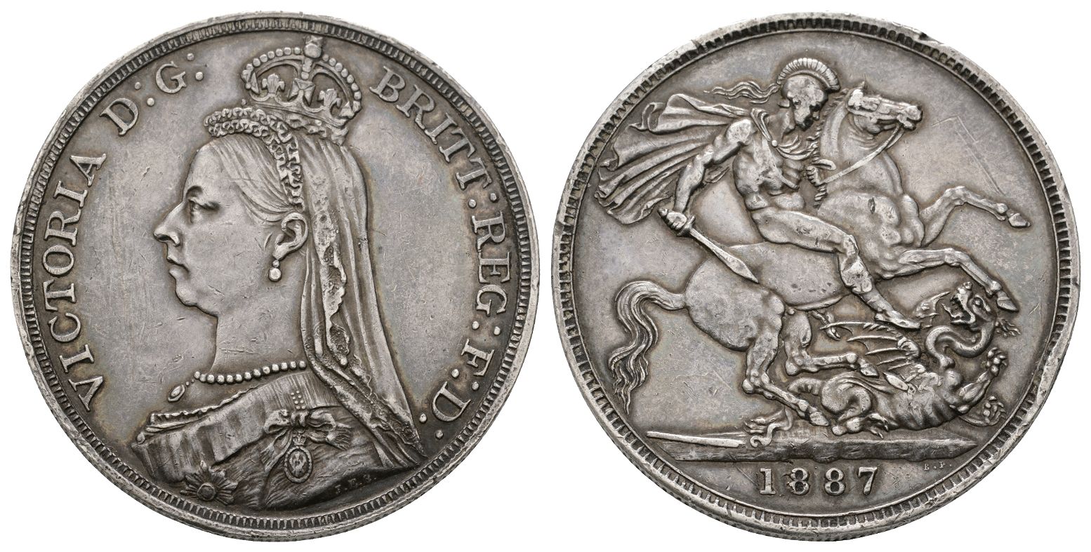 London mint. Dated 1887. Old Head coinage. Designs by Joseph Edgar Boehm and Benedetto Pistrucci. VICTORIA D: G: BRITT: REG: F: D:, crowned, veiled and draped bust to left; J.E.B. in small lettering on truncation / St. George on horseback to right, holding sword with right hand and wearing plumed helmet and billowing cloak, slaying the dragon which falls to right; small B. P. beneath ground line to right, date in exergue. SCBC 3921; KM 765. 28.24gr, 38mm, 12h
