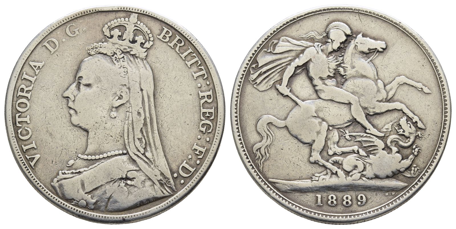 London mint. Dated 1889. Jubilee coinage. Designs by Joseph Edgar Boehm and Benedetto Pistrucci. VICTORIA D: G: BRITT: REG: F: D:, crowned, veiled and draped bust to left; J.E.B. in small lettering on truncation / St. George on horseback to right, holding sword with right hand and wearing plumed helmet and billowing cloak, slaying the dragon which falls to right; small B. P. beneath ground line to right, date in exergue. SCBC 3921; KM 765. 27.70gr, 39mm, 12h.