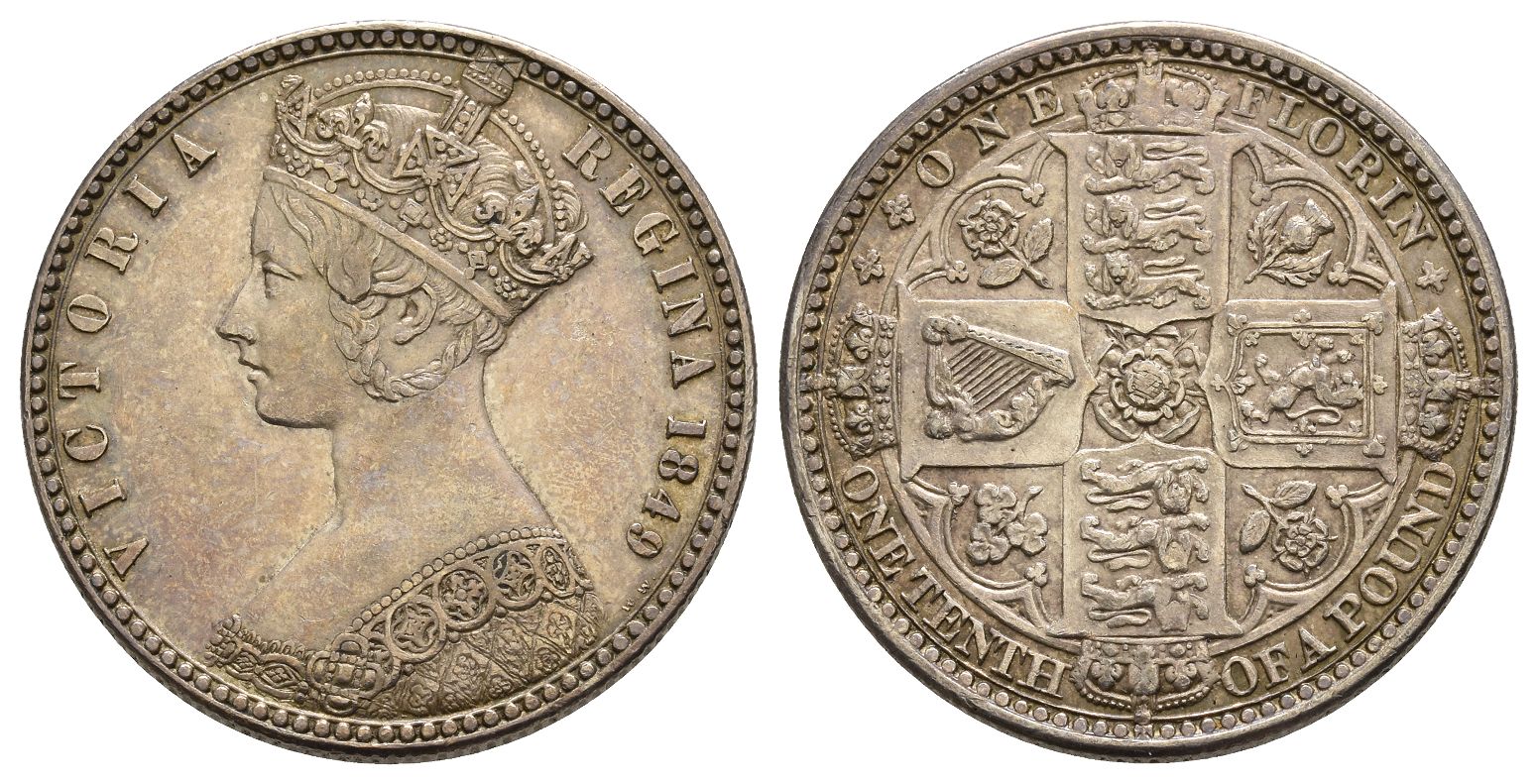 Designs by William Wyon and William Dyce. VICTORIA REGINA 1849, crowned 'Gothic' head of Queen Victoria to left; W.W. in small lettering behind / ONE FLORIN ONE TENTH OF A POUND, crowned, cruciform shields, rose in centre, floral emblems in angles. Bull 2815; ESC 802; SCBC 3890. 11.33gr, 28mm, 6h.