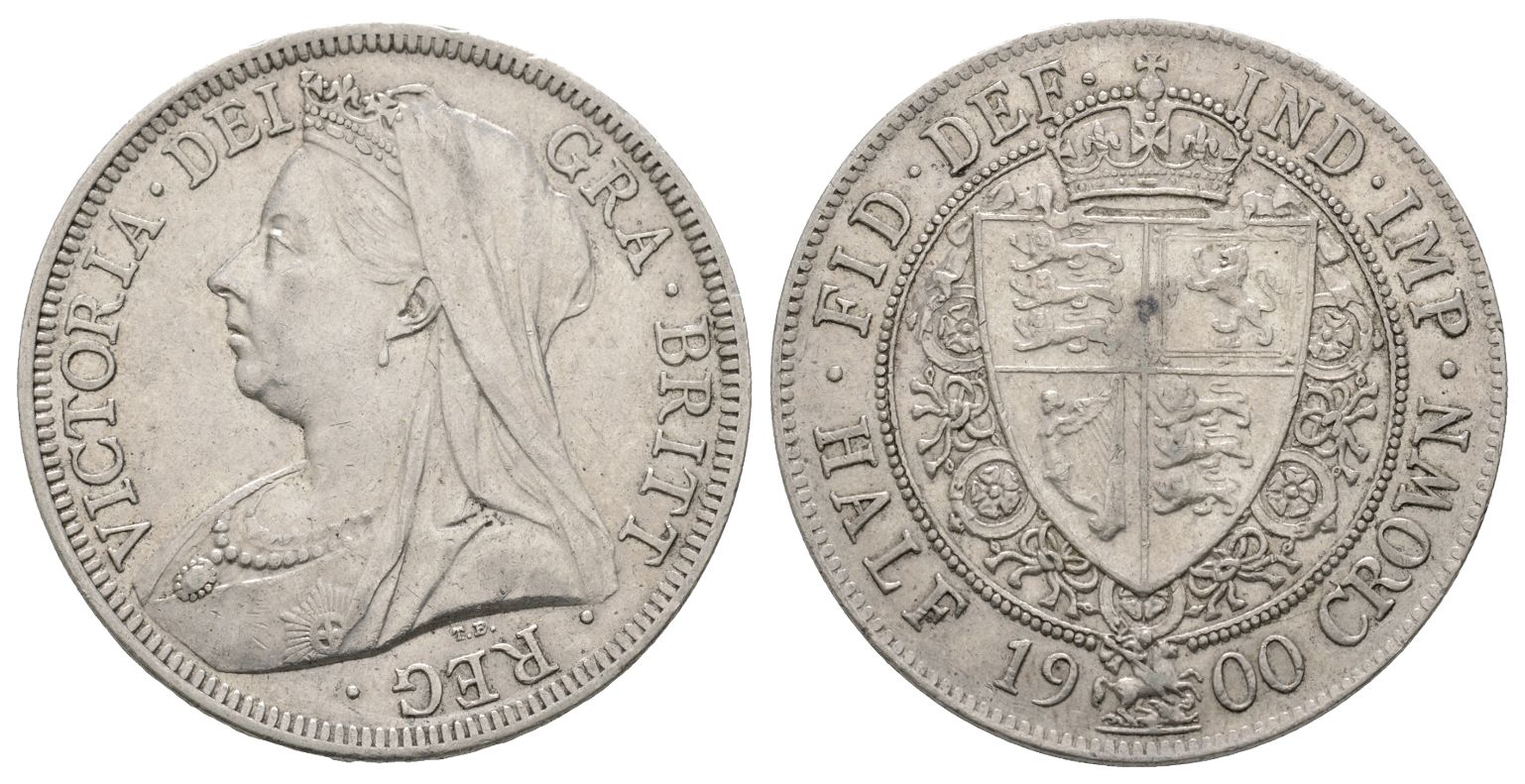 London mint. Dated 1900. Design by Sir Thomas Brock. VICTORIA DEI. GRA. BRITT. REG., crowned, veiled and draped bust to left / FID. DEF. IND. IMP., crowned spade-shaped shield surrounded by Collar of the Garter within beaded border; date and denomination around below. SCBC 3938; KM 782. 14.11gr, 32mm, 12h