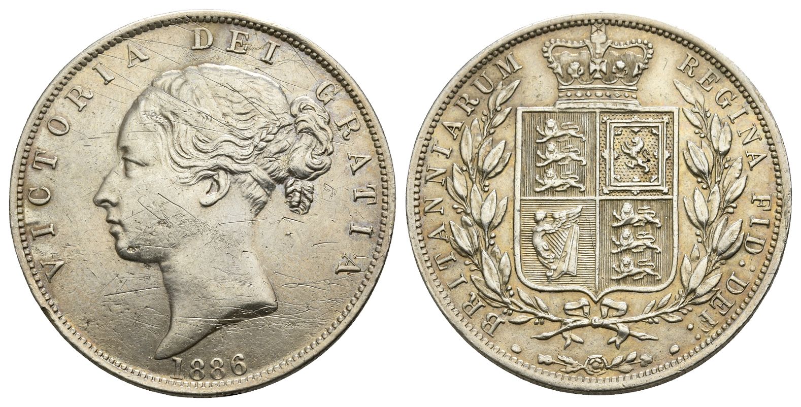 London mint. Dated 1886. Design by William Wyon. VICTORIA DEI GRATIA, young head to left; date below / BRITANNIARUM REGINA FID : DEF :, crowned shield within laurel wreath; rose, thistle and shamrock below. Bull 2767; ESC 715; SCBC 3889. 13.94gr, 31mm, 6h.