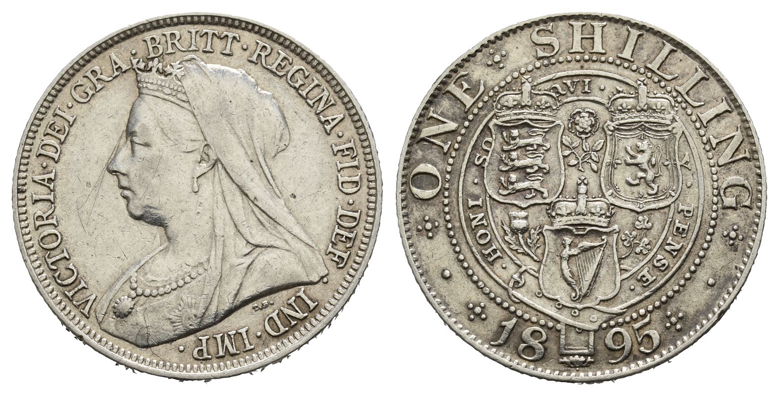 London mint. Dated 1895. Old Head Coinage. Small rose type. Design by Sir Thomas Brock and Edward Paynter. VICTORIA · DEI · GRA · BRITT · REGINA · FID · DEF · IND · IMP ·, crowned and veiled bust to left / Three crowned shields set in shape of a 'V' mostly within Garter, floral emblems between; date below; ONE SHILLING above. Bull 3158; ESC 1364A; SCBC 3940. 5.63gr, 24mm, 12h.