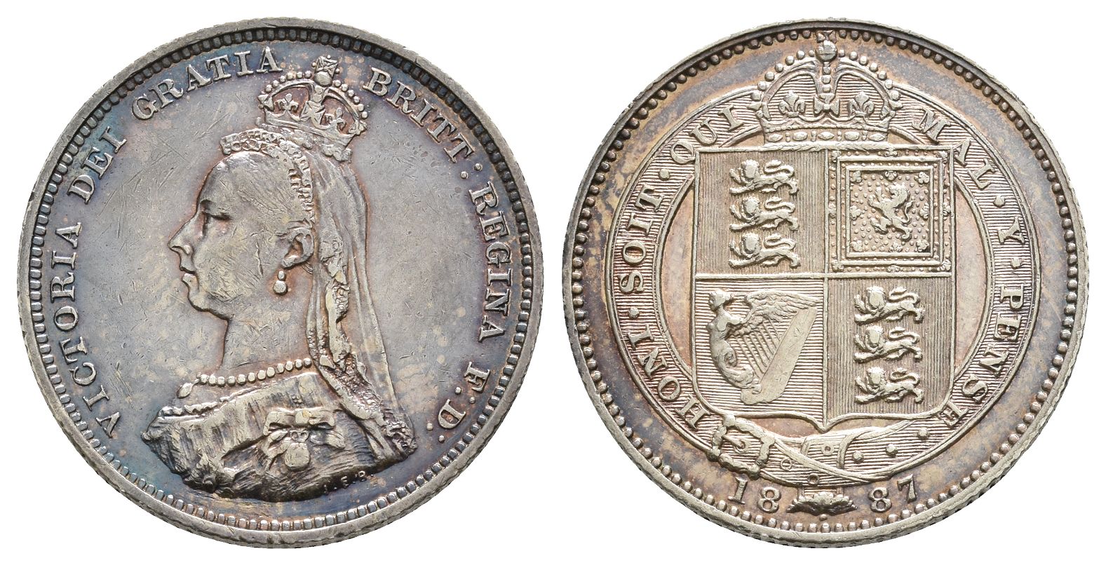 Design by Joseph Edgar Boehm. VICTORIA DEI GRATIA BRITT : REGINA F: D:, crowned and draped bust head to left; J.E.B. in small lettering on truncation / Crowned square shield within Garter inscribed HONI ✿ SOIT ✿ QUI MAL ✿ Y ✿ PENSE ✿✿✿; date below. Bull 3137; ESC 1351; SCBC 3926. 5.64gr, 24mm, 12h.