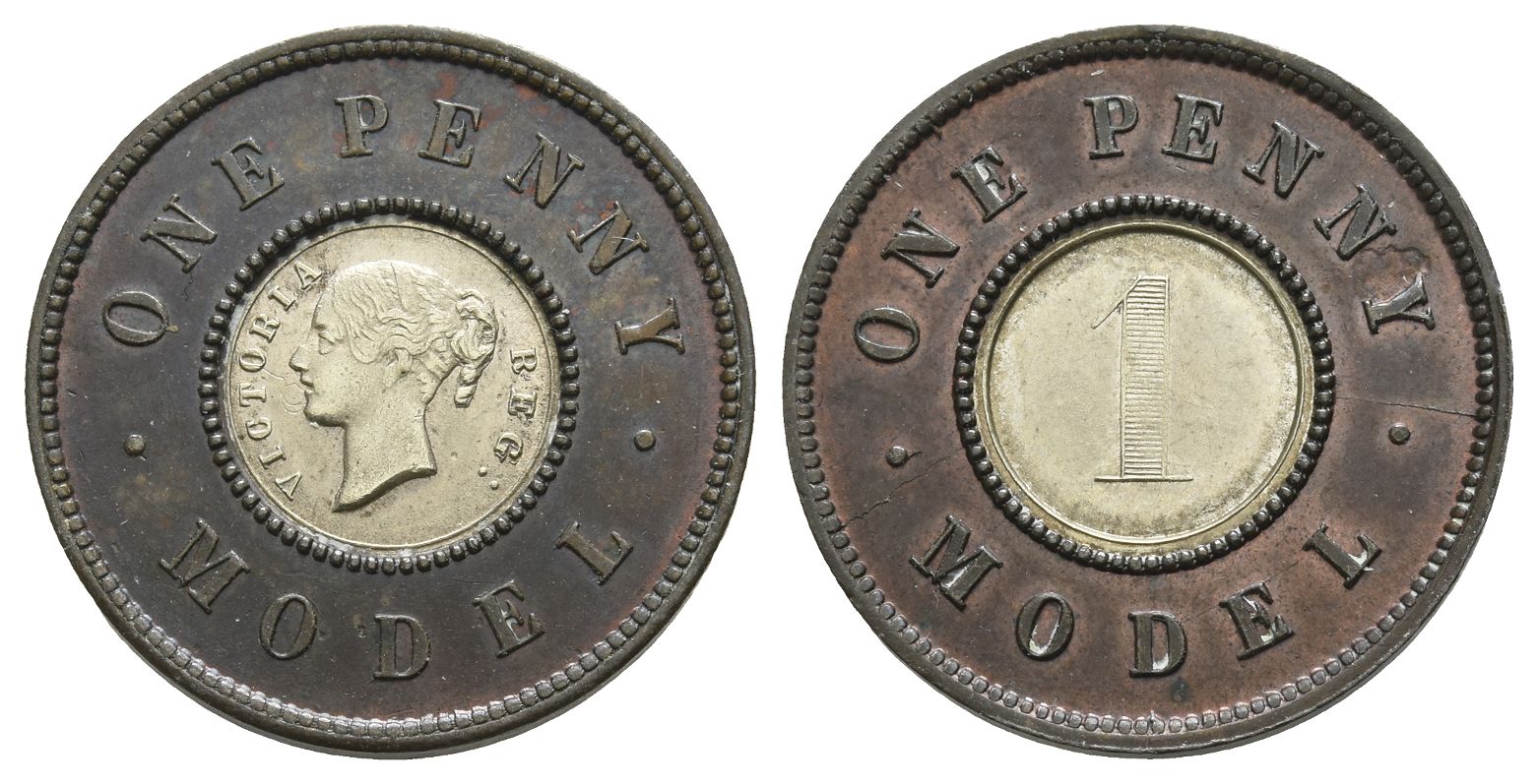 Struck 1844. Design by Joseph Moore. • ONE PENNY • MODEL •, head to left; VICTORIA before, REG: behind / • ONE PENNY • MODEL •, denomination in centre. TC 375285. 3.64gr, 22mm, 12h.