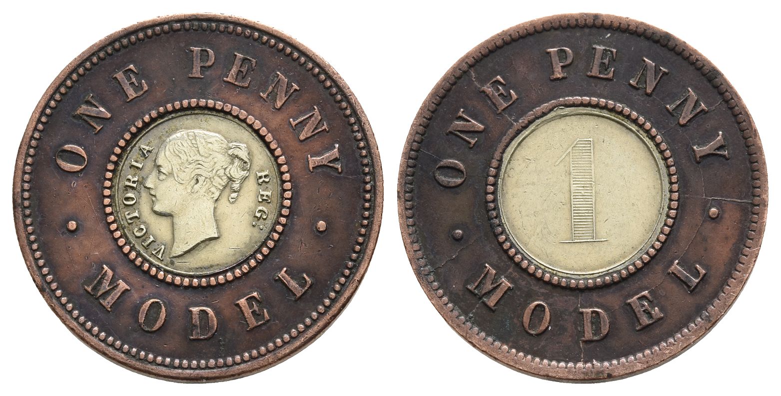 • ONE PENNY • MODEL •, head to left; VICTORIA before, REG: behind / • ONE PENNY • MODEL •, denomination in centre. TC 375285. 3.85gr, 22mm, 12h.