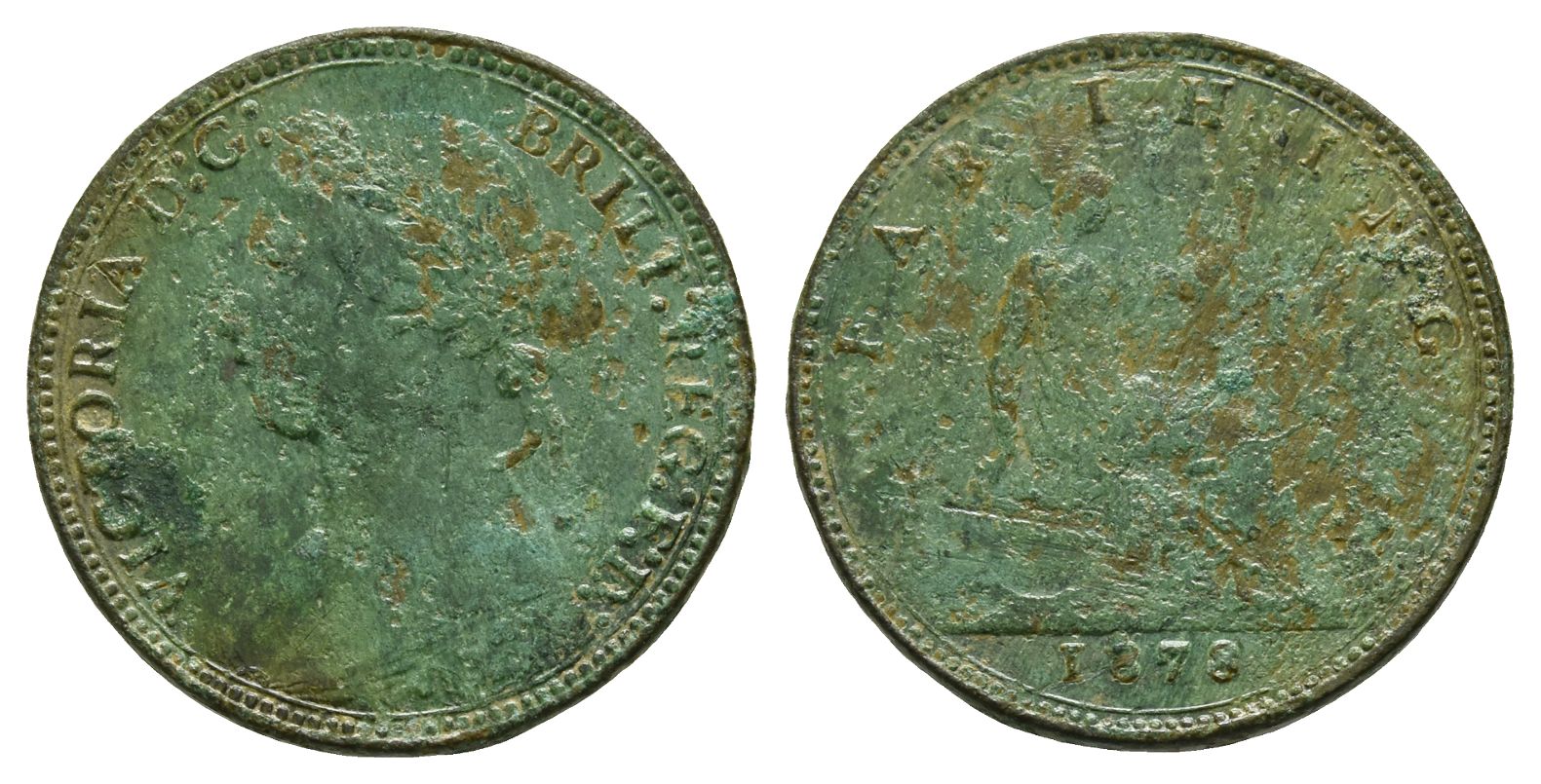 Royal (Tower Hill) mint. Dated 1878. 'Bun Head' type. VICTORIA D: G: BRITT: REG: F: D:, laureate and draped bust to left / F A R T H I N G, Britannia seated to right, holding transverse trident in left hand, and shield with Union flag in right hand, date in exergue; sea behind with lighthouse on left and ship on right. SCBC 3958; Freeman 536. 2.53gr, 20mm, 12h.