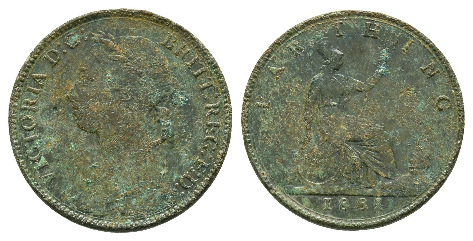 Royal (Tower Hill) mint. Dated 1881. 'Bun Head' type. VICTORIA D: G: BRITT: REG: F: D:, laureate and draped bust to left / F A R T H I N G, Britannia seated to right, holding transverse trident in left hand, and shield with Union flag in right hand, date in exergue; sea behind with lighthouse on left and ship on right. SCBC 3958; cf. Freeman 545/6. 2.58gr, 20mm, 12h.