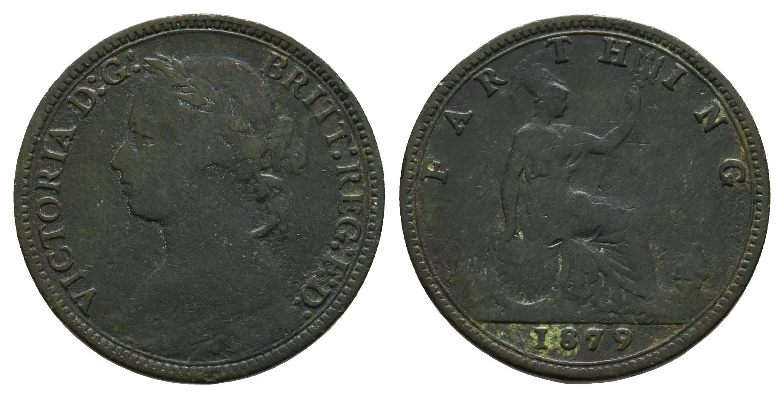 Royal (Tower Hill) mint. Dated 1879. 'Bun Head' type. VICTORIA D: G: BRITT: REG: F: D:, laureate and draped bust to left / F A R T H I N G, Britannia seated to right, holding transverse trident in left hand, and shield with Union flag in right hand, date in exergue; sea behind with lighthouse on left and ship on right. SCBC 3958; Freeman 538. 2.52gr, 20mm, 12h.