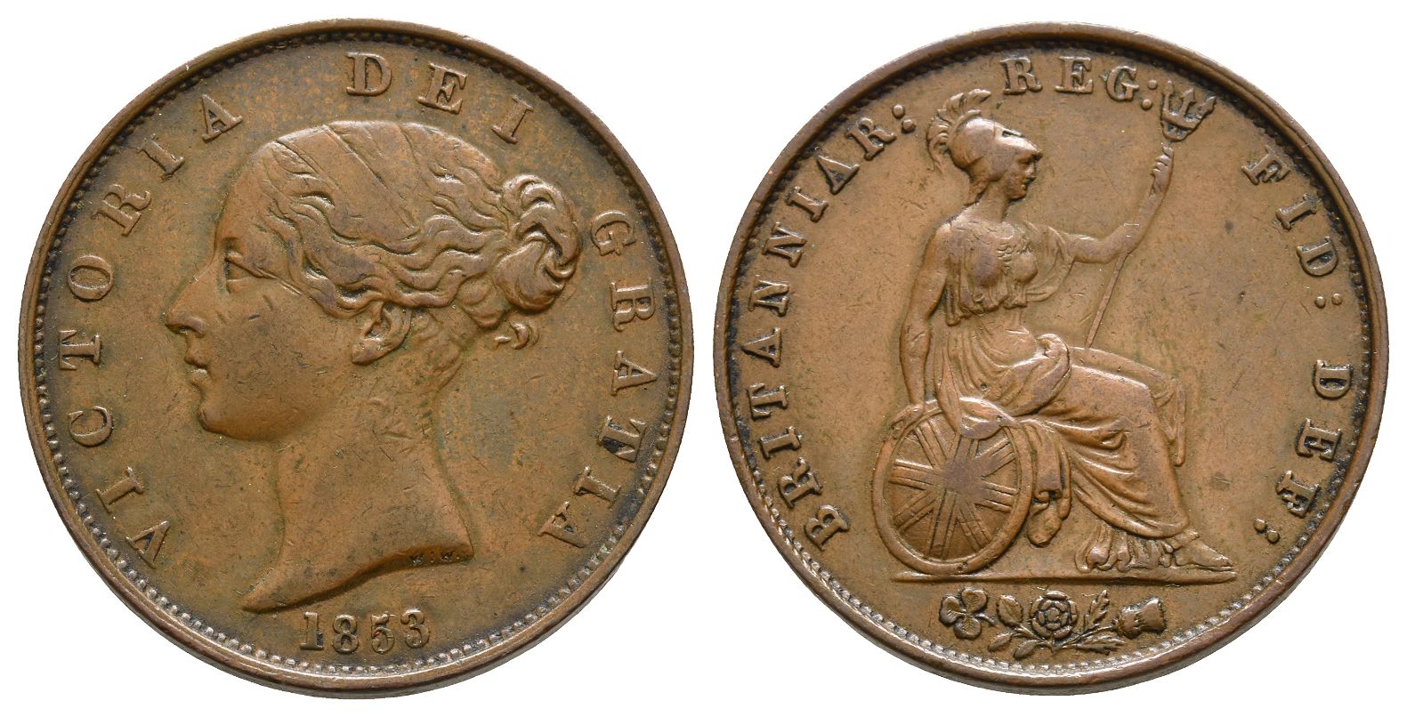 London mint. Dated 1853. Design by William Wyon. VICTORIA DEI GRATIA, young head of Victoria to left; W:W. in small lettering on truncation; date below. / BRITANNIAR: REG: FID: DEF:, Britannia seated to right, holding trident in left hand, and shield with Union flag in right hand; national flower emblems in exergue. SCBC 3949. 9.54gr, 28mm, 12h.