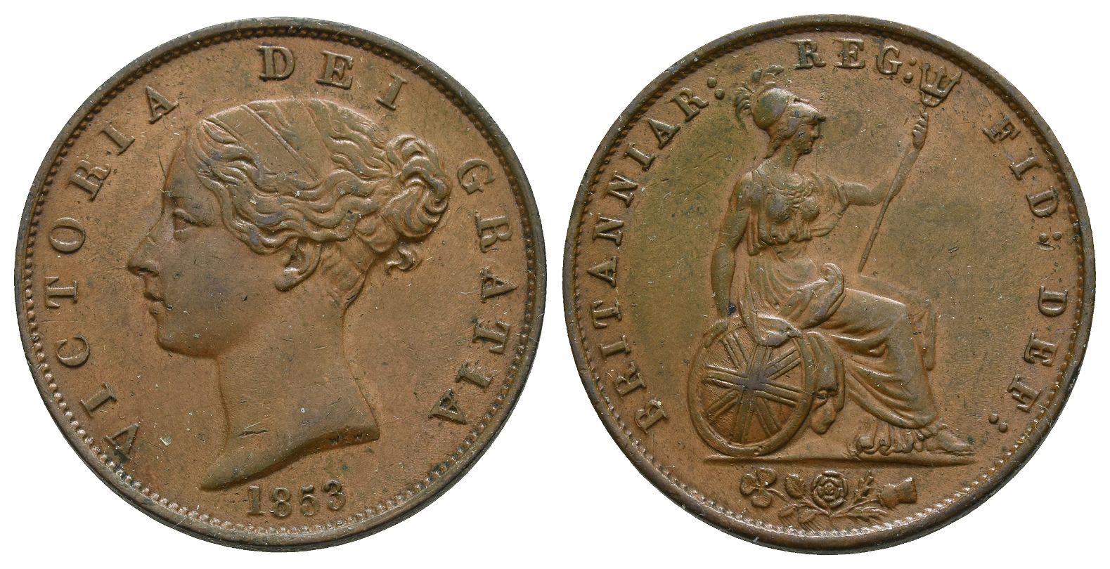 London mint. Dated 1853. Design by William Wyon. VICTORIA DEI GRATIA, young head of Victoria to left; W:W. in small lettering on truncation; date below. / BRITANNIAR: REG: FID: DEF:, Britannia seated to right, holding trident in left hand, and shield with Union flag in right hand; national flower emblems in exergue. SCBC 3949. 9.84gr, 28mm, 12h.