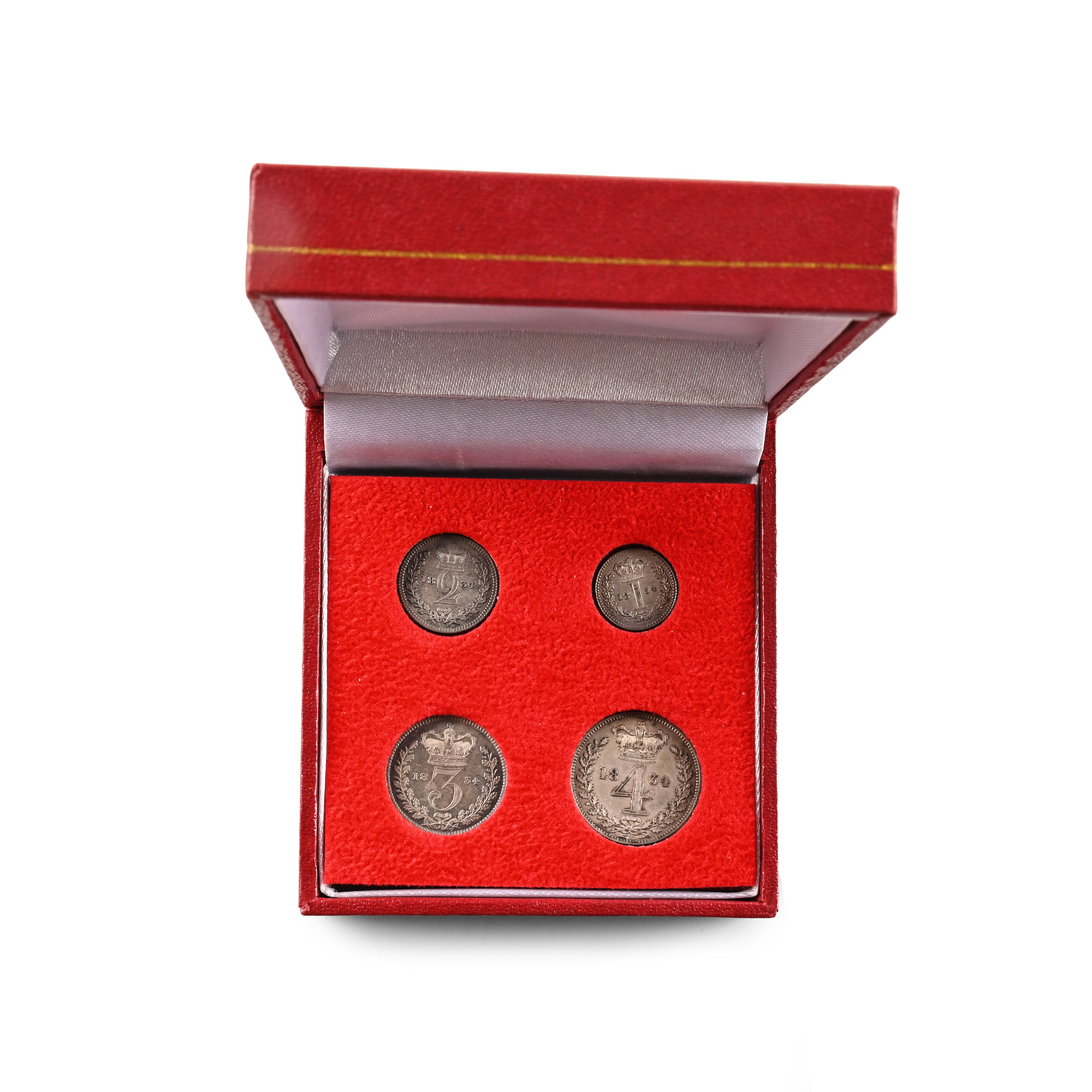 Comprising: Set of Four, Three, Two and One Penny denominations in a Maundy coin box. SCBC 3840. 50.46gr total.