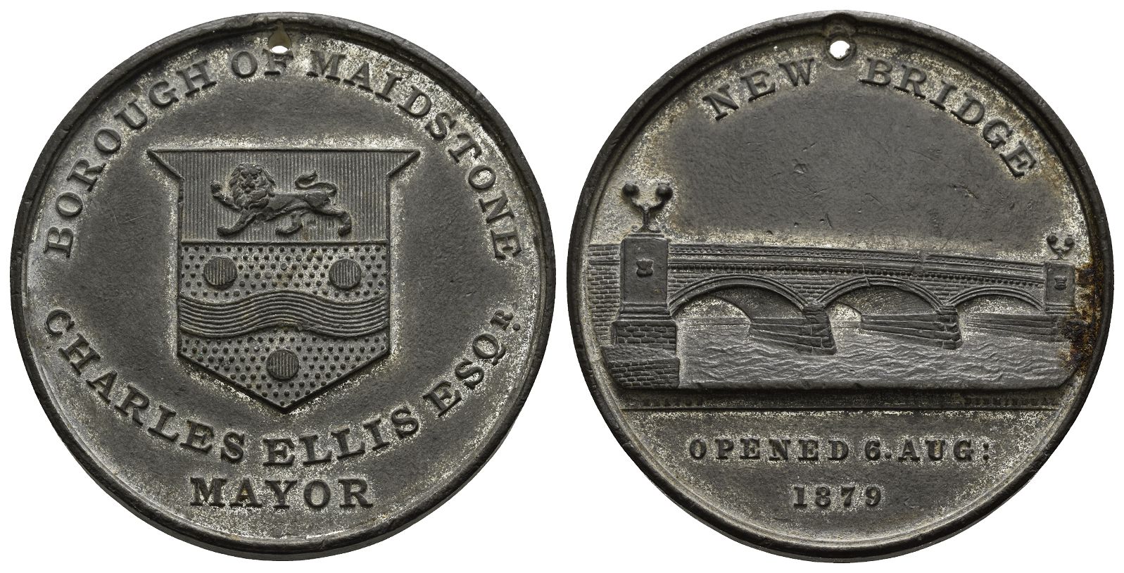 Birmingham mint (R. Heaton and Sons). BOROUGH OF MAIDSTONE CHARLES ELLIS ESQR MAYOR, borough arms / NEW BRIDGE OPENED 6. AUG : 1879, view of the bridge; HEATON BIRMINGHAM in small lettering beneath bridge. BHM 3060. 21.63gr, 41mm, 12h.