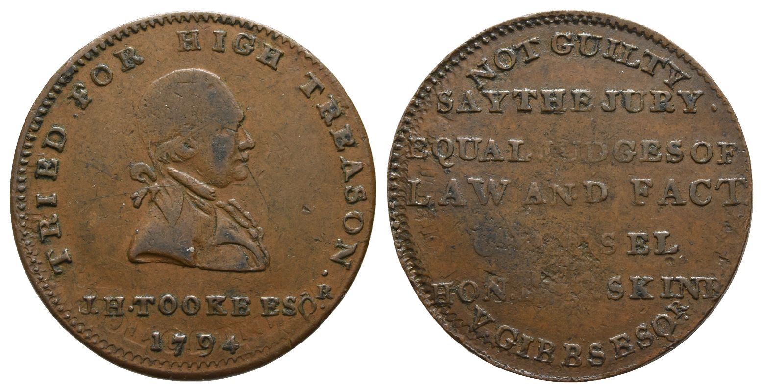 TRIED FOR HIGH TREASON J. H. TOOKE ESQR, bust to right, date below / NOT GUILTY SAY THE JURY EQUAL JUDGES OF LAW AND FACT COUNSEL HON T ERSKINE V GIBBS ESQR in seven lines. DH.1047. 8.61gr, 28mm, 6h