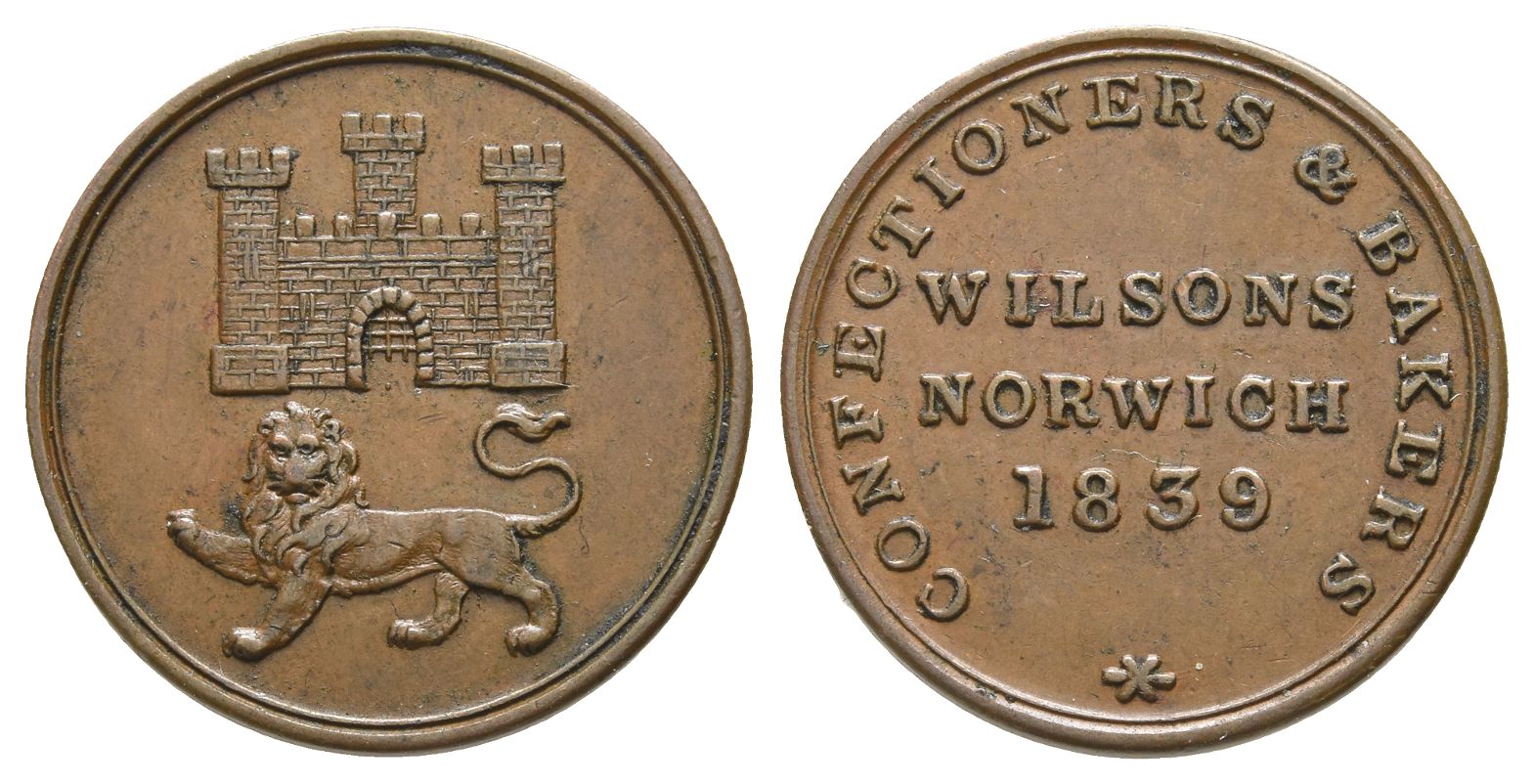 WILSONS NORWICH in two lines above date, CONFECTIONERS AND BAKERS around / The Arms of the City of Norwich: triple-towered castle above lion passant. Edge: Plain. Bell. 4050; Batty. 598; Withers2.8770. 3.63gr, 21mm, 12h