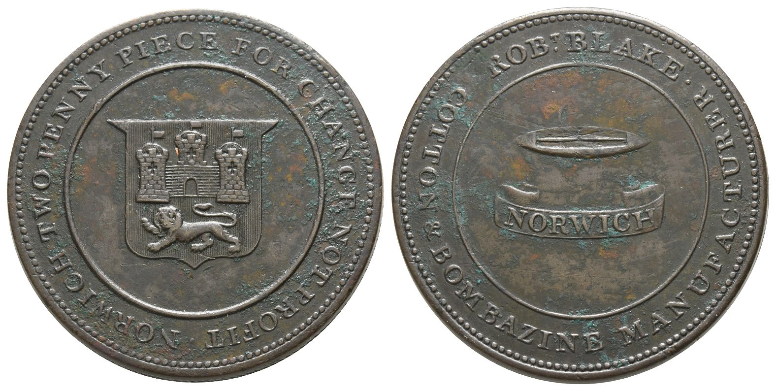 ROBT. BLAKE · COTTON & BOMBAZINE MANUFACTURER · NORWICH, weaving shuttle above Norwich ribbon banner / NORWICH TWO PENNY PIECE FOR CHANGE NOT PROFIT ·, the Arms of the City of Norwich, consisting of lion beneath triple-turreted castle gateway. Edge: Diagonal centre milling. Withers. 910; Davis. 17. 44.86gr, 41mm, 6h