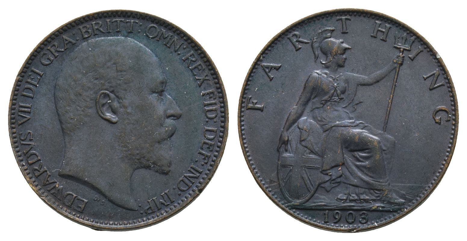 London mint. Dated 1903. Design by George William de Saulles. EDWARDVS VII DEI GRA: BRITT: OMN: REX FID: DEF: IND: IMP:, bare head to right / FARTHING, seated figure of Britannia facing to right, trident in left hand, shield with Union flag in right hand, sea behind; date below. SCBC 3992. 2.91gr, 20mm, 12h.