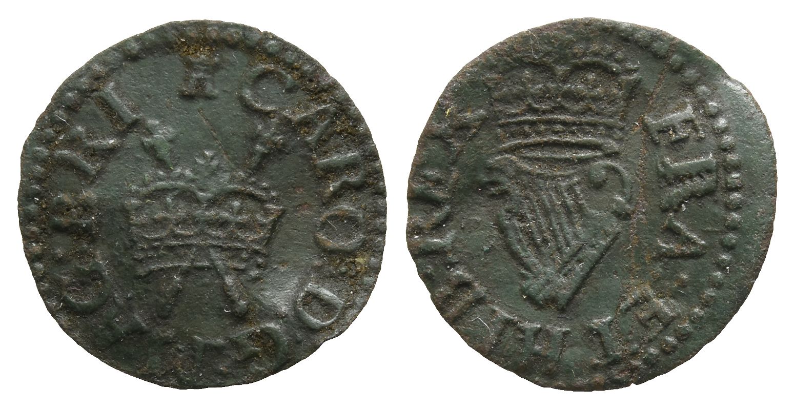 London mint; i.m: castle. (Castle) CARO : D : G • MAG • BRI, crown over crossed lis-tipped sceptres / FRA • ET HIB • REX, crowned eagle-headed harp. SCBC 3183. 0.37gr, 16mm, 6h.