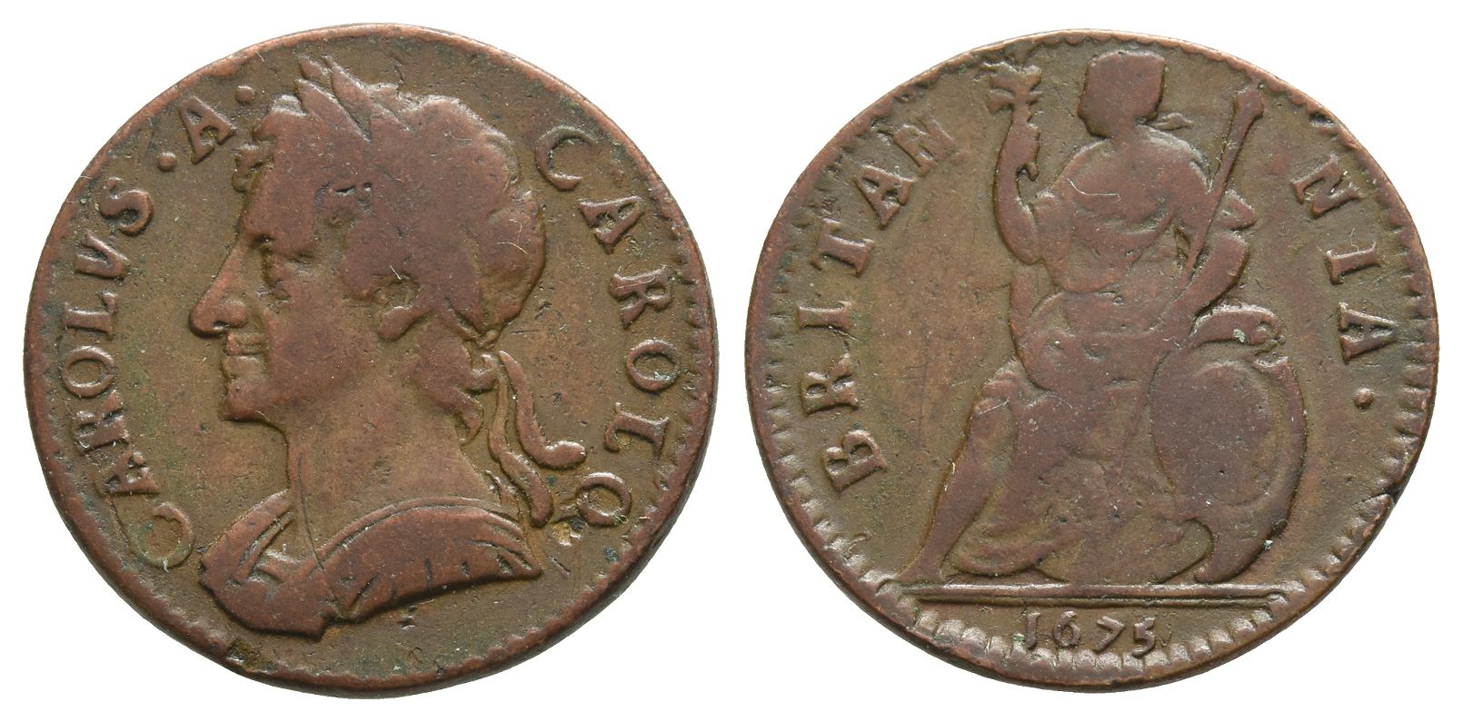 Back to previous pageGreat Britain. Stuart, Charles II CU Farthing. Dated 1675. Tower (London) mint.