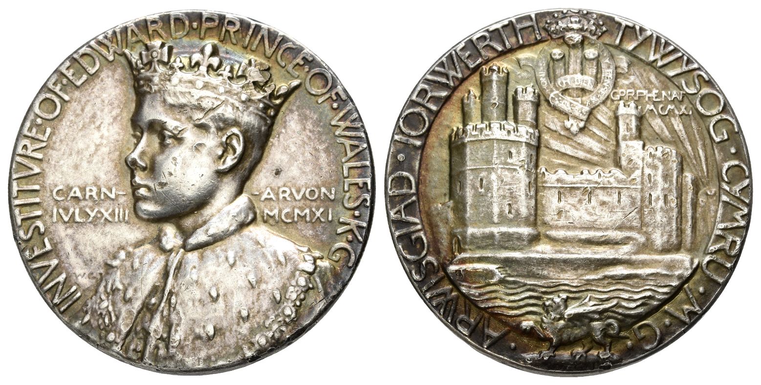 London mint. Dated 13 July 1911. Design by Sir W. Goscombe John. INVESTITVRE • OF • EDWARD • PRINCE • OF • WALES • K • G, youthful crowned bust facing slightly to left, wearing coronation regalia; CARN- -ARVON IVLY • XIII MCMXI in two lines across fields / TУWУSOG • CУMRU • M • G • • ARWISGIAD • IORWERTH, view of Caernarfon Castle, seen from Afon Seiont, at dawn with rays in background; above, crowned plumes within Garter; GoRPHENAF MCMXI in two lines in right field; in exergue, Y Ddraig Goch (Welsh Dragon). Giordano CM23b; BHM 4079; Eimer 1925. 22.05gr, 34mm, 12h