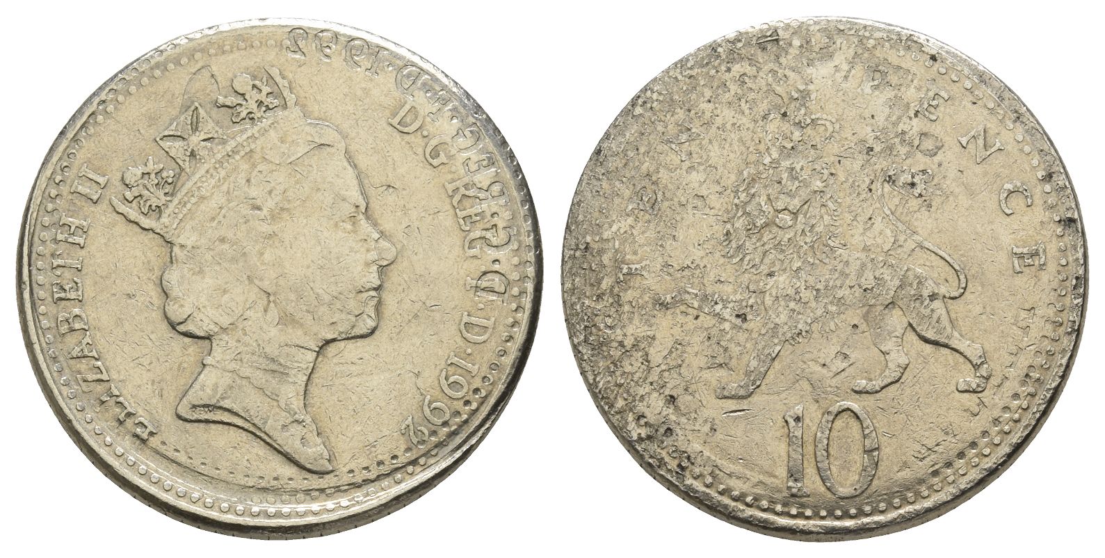 Royal mint. Dated 1992. Designs by Raphael David Maklouf and Christopher Ironside. ELIZABETH II D · G · REG · F · D · 1992, third crowned portrait of Queen Elizabeth II to right, wearing the George IV State Diadem; RDM in small lettering on truncation / TEN PENCE 10, part of the crest of England, lion passant guardant royally crowned; denomination around. KM 938b; S F4. 6.45gr, 25mm, 12h.