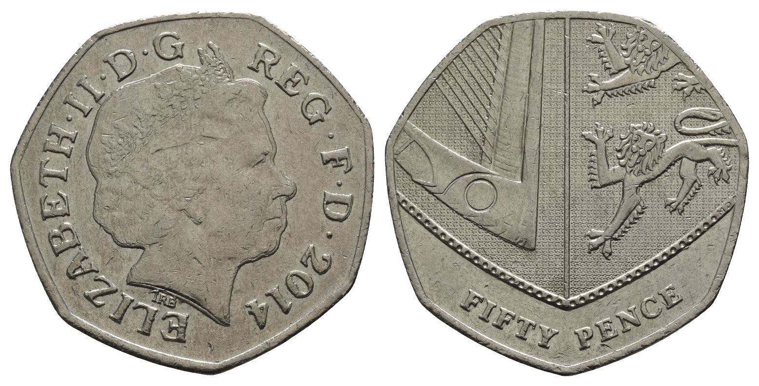 Royal mint. Dated 2014. Designs by Ian Rank-Broadley and Matthew Dent. ELIZABETH · II · D · G REG · F · D · 2014, fourth crowned portrait of Queen Elizabeth II to right, wearing the Girls of Great Britain and Ireland tiara; IRB in small lettering beneath truncation / FIFTY PENCE, lower section of the Royal Shield, denomination below; MD in small lettering to lower right. KM 1112; S H18. 7.95gr, 27mm, 12h.