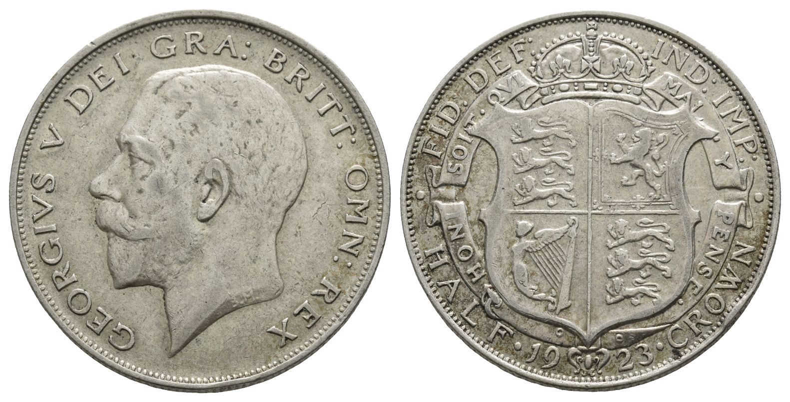 Royal mint. Dated 1923. Design by Bertram Mackennal. GEORGIVS V DEI GRA: BRITT: OMN: REX, bare head to left; B.M. in small lettering on truncation / FID. DEF : IND : IMP, crowned shield surrounded by the Garter; date and denomination around below. SCBC 4021A; KM 818.2. 14.05gr, 32mm, 1h