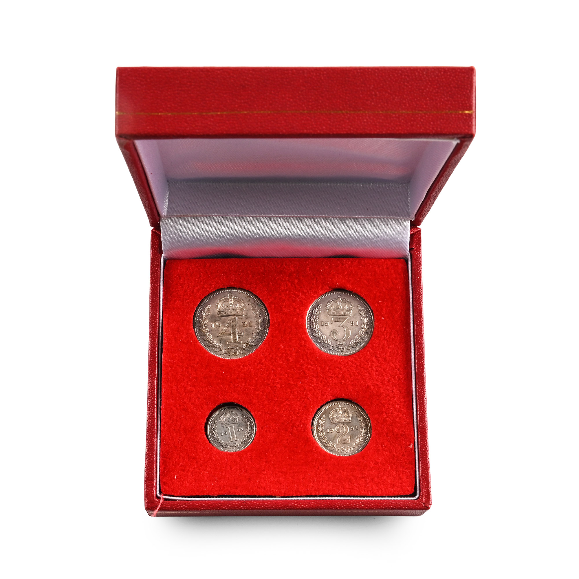 Comprising: Set of Four, Three, Two and One Penny denominations in a Maundy coin box. SCBC 4043. 49.34gr total.
