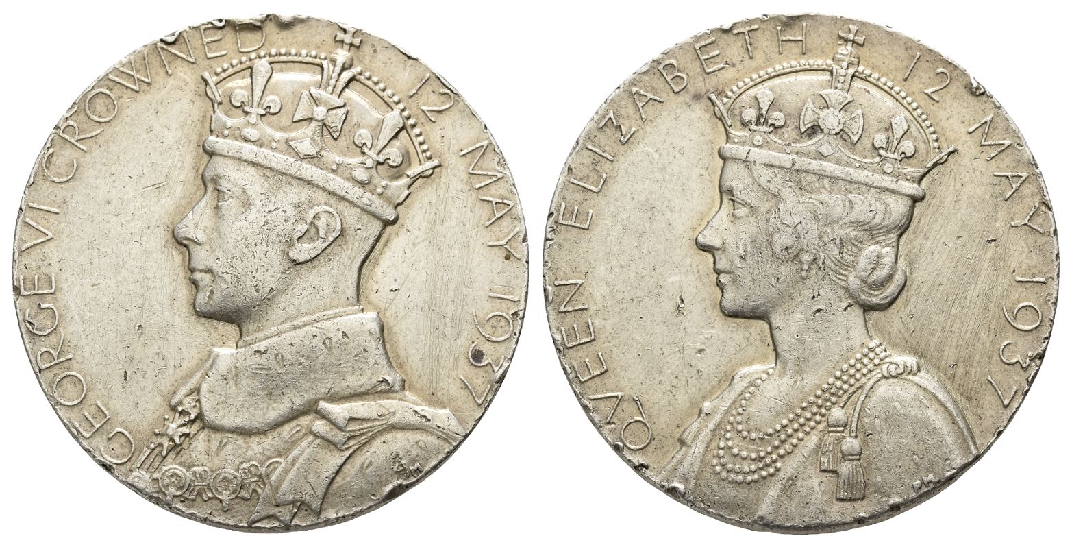 London mint. Dated 12 May 1937. Design by Percy Metcalfe. GEORGE VI CROWNED 12 MAY 1937, crowned bust of King George VI to left; P M in small lettering on shoulder / QUEEN ELIZABETH 12 MAY 1937, crowned bust of Queen Elizabeth to left; P M in small lettering on shoulder. BHM 4314; Eimer 2046a. 15.65gr, 31mm, 12h