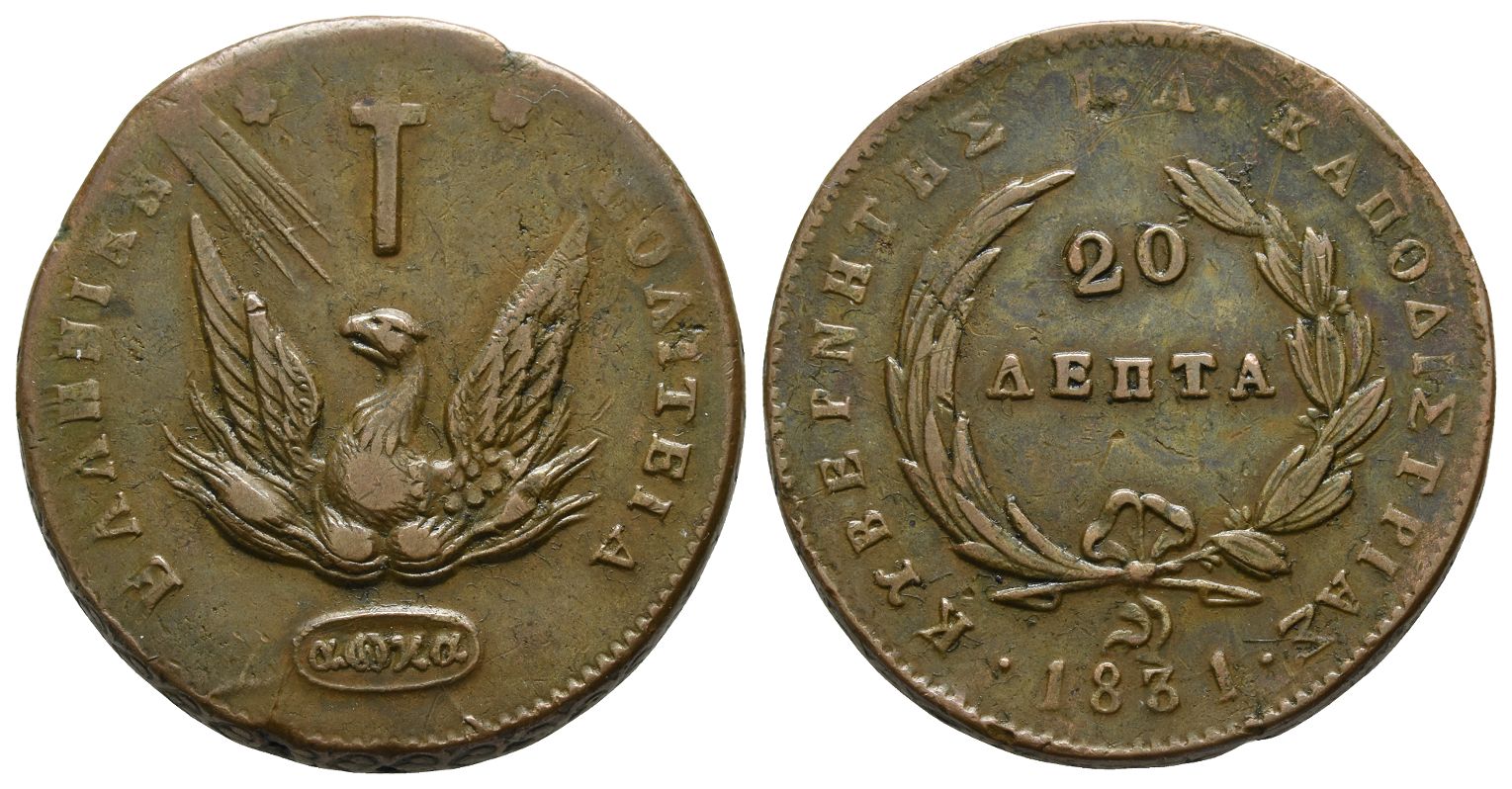 Aegina mint. Dated 1831. Designs by Georgios Papakonstantopoulos and Dimitrios Kontos. ΕΛΛΗΝΙΚΗ ΠΟΛΙΤΕΙΑ, Phoenix rising from flames, head upturned to left, with wings spread; rays to upper left, long cross above; αωκα (1821) on raised oval tablet below / ΚΥΒΕΡΝΗΤΗΣ Ι. Α. ΚΑΠΟΔΙΣΤΡΙΑΣ, 20 ΛΕΠΤΑ (denomination) within olive and laurel branches; date below. KM11; Chase 501 (Q-p). 35.55gr, 36mm, 12h.