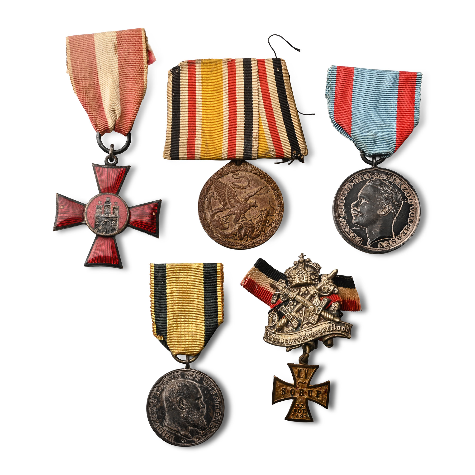 Including: King Wilhelm I 'for bravery and loyalty' medal and ribbon; medal and ribbon with pendant cross 'Krieger-Verein Sörup 22.Oct.1892'; service medal from Ernst Ludwig of Hessen with ribbon; China 1900-1901 service medal with ribbon and metal carrier; military service cross in red enamel with ribbon. 87gr total, 6.3-11cm.