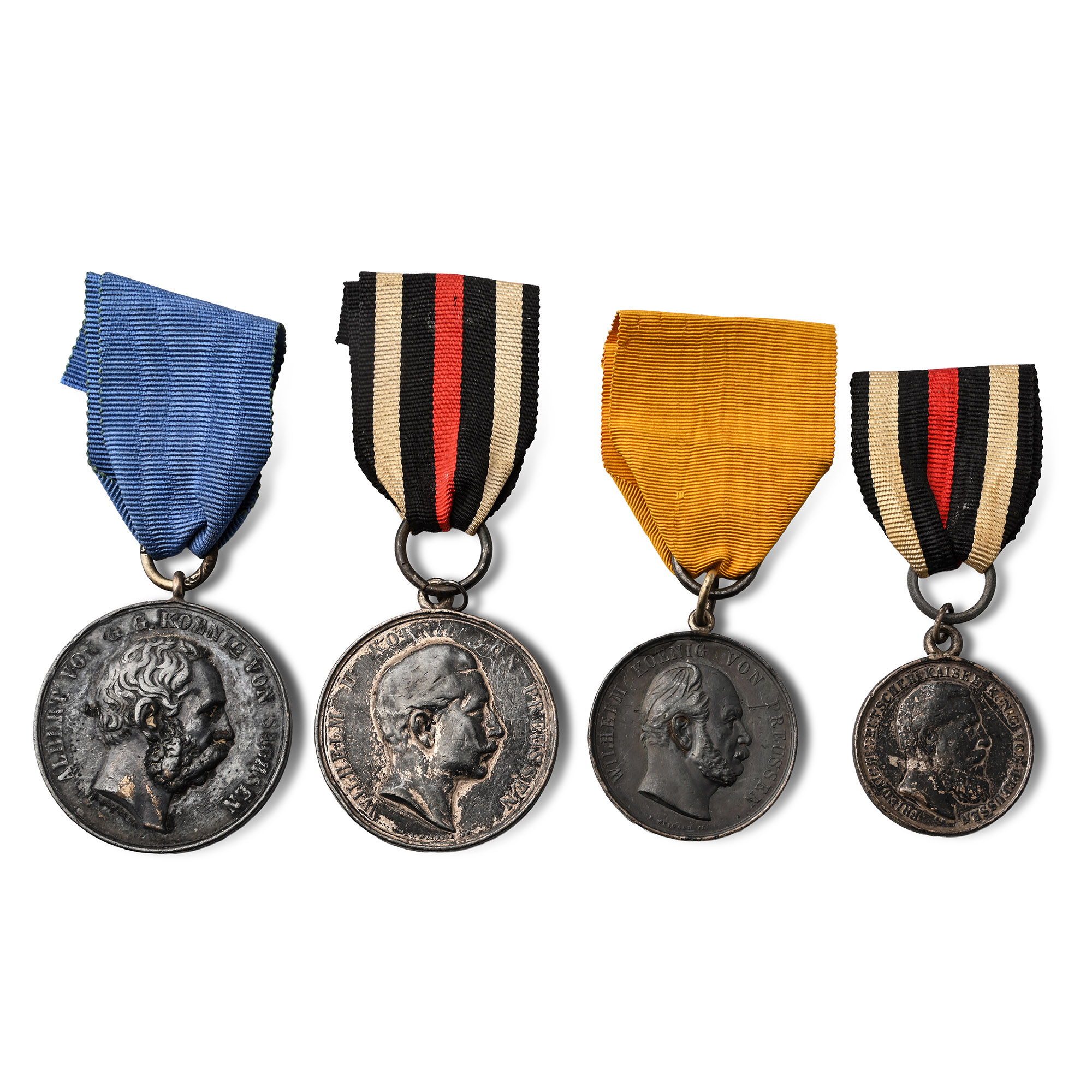 Including: Preussen 1888 'Dem besten Schützen' Friedrich III medal and ribbon; 'Dem besten Schützen' Albert von Sachsen medal and ribbon; 'Dem besten schützen' Wilhelm II Preussen medal and ribbon; 'Dem besten schützen' Wilhelm II Preussen medal and ribbon with dedication 'W. Mohrmann 1886'. 125gr total, 9.6-11.7cm.