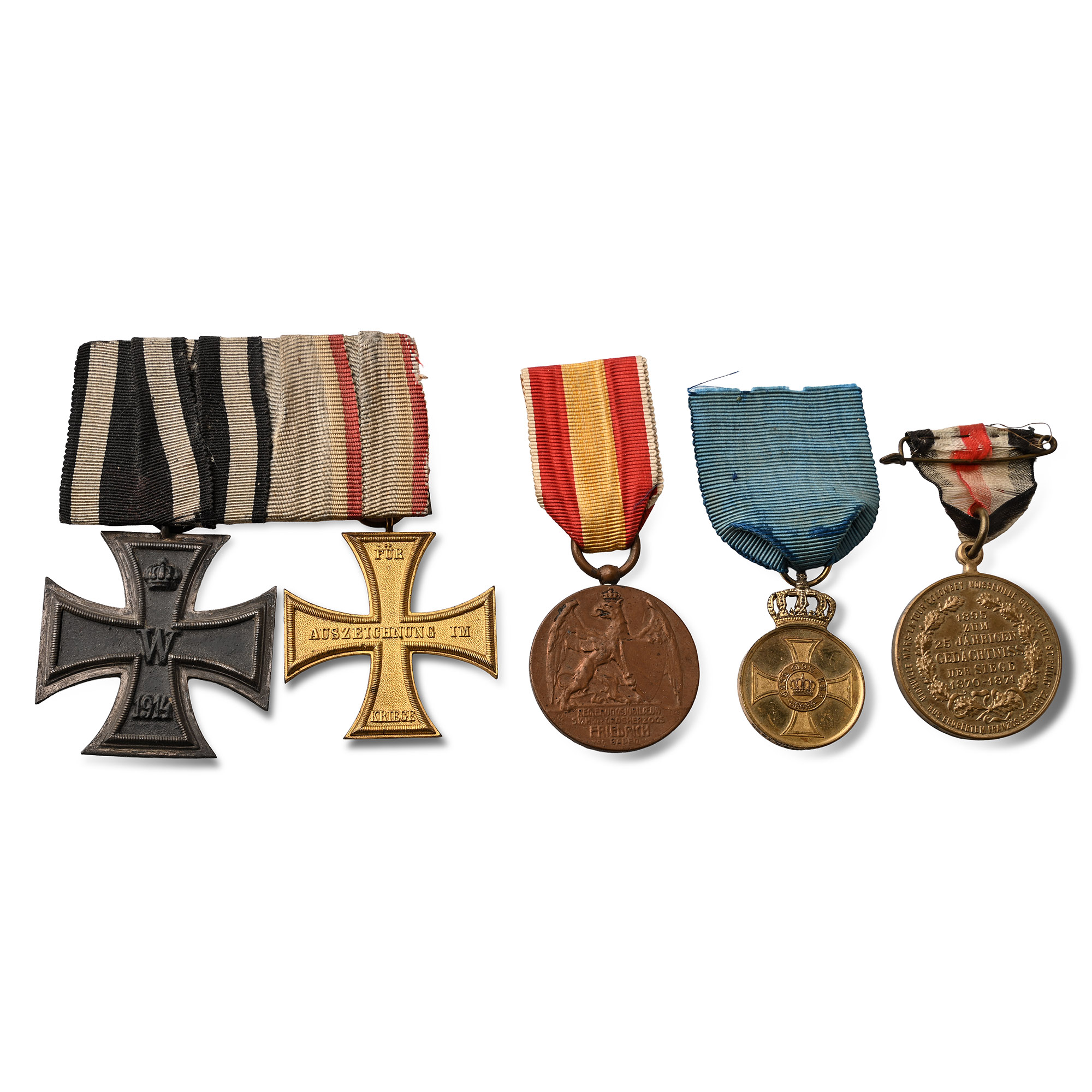 Including: two Iron Cross medals on carrier with ribbons; Prussia Medal 1895 25th Anniversary Commemoration of Victories 1870 -1871; Regierungs-Jubiläums-Medaille von 1902 with ribbon; and one other. 96gr total, 74-82mm.