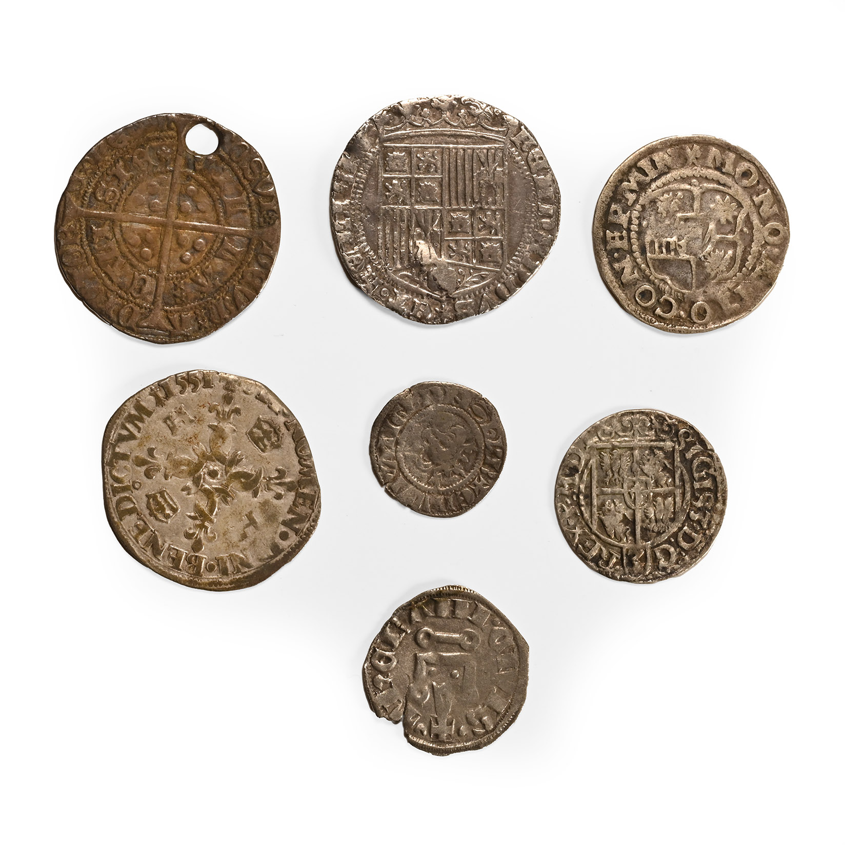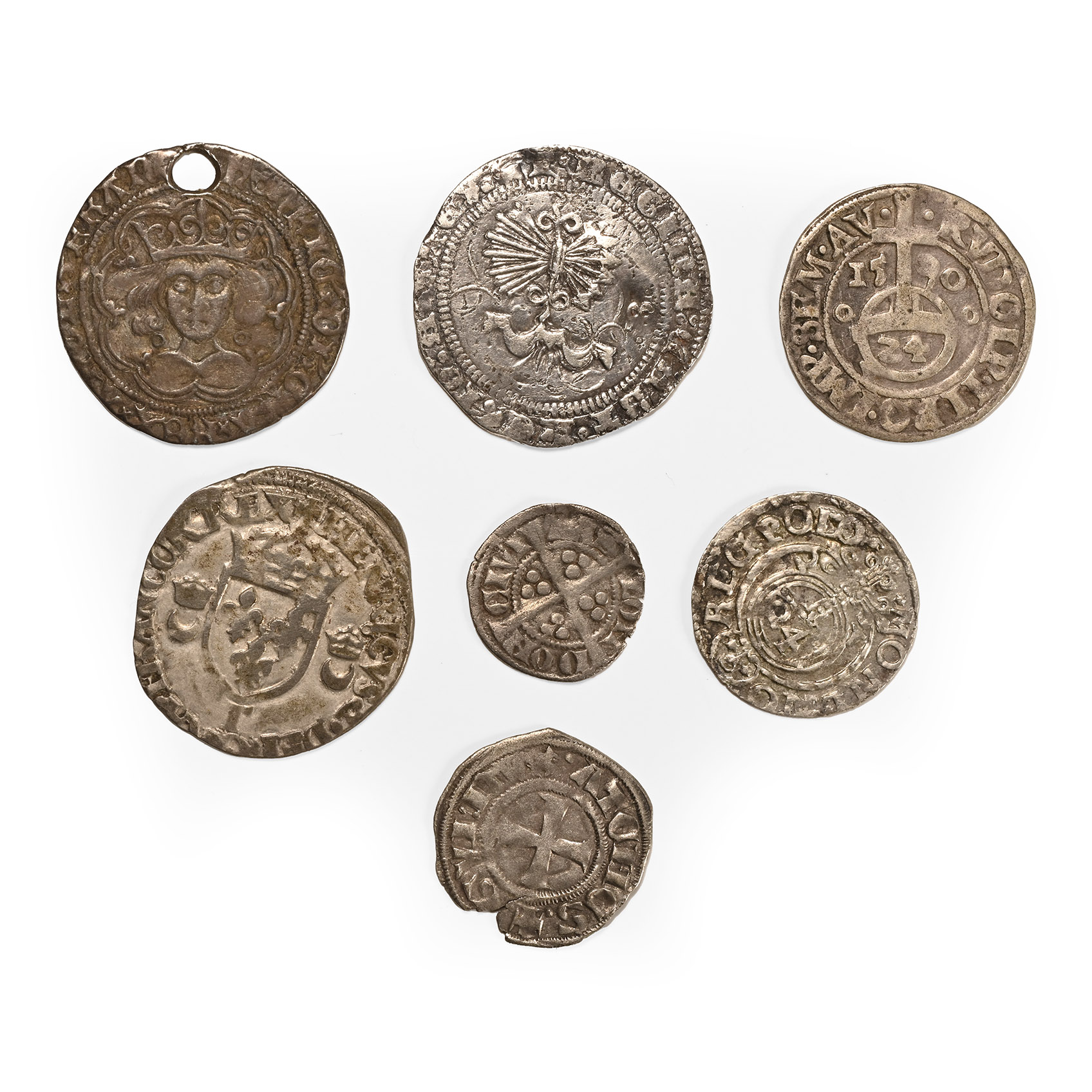 Group of a pierced Edward IV Groat, an Edward II halfpenny, a Douzain aux croissants of Henry II, and four with collector's tickets: Guy II Duchy of Athens, two of Ferdinand and Isabella of Spain, and a Three Polker of Sigismund III dating to 1621. 13.20gr total, 15-25 mm