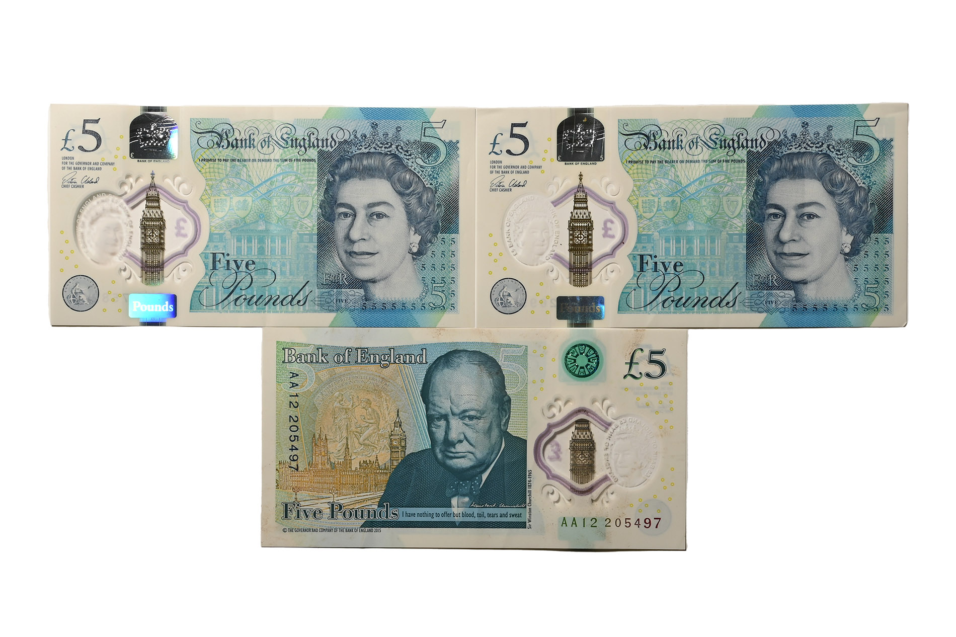 Group of Three [3] England, Elizabeth II Five Pounds Banknotes. 2015.