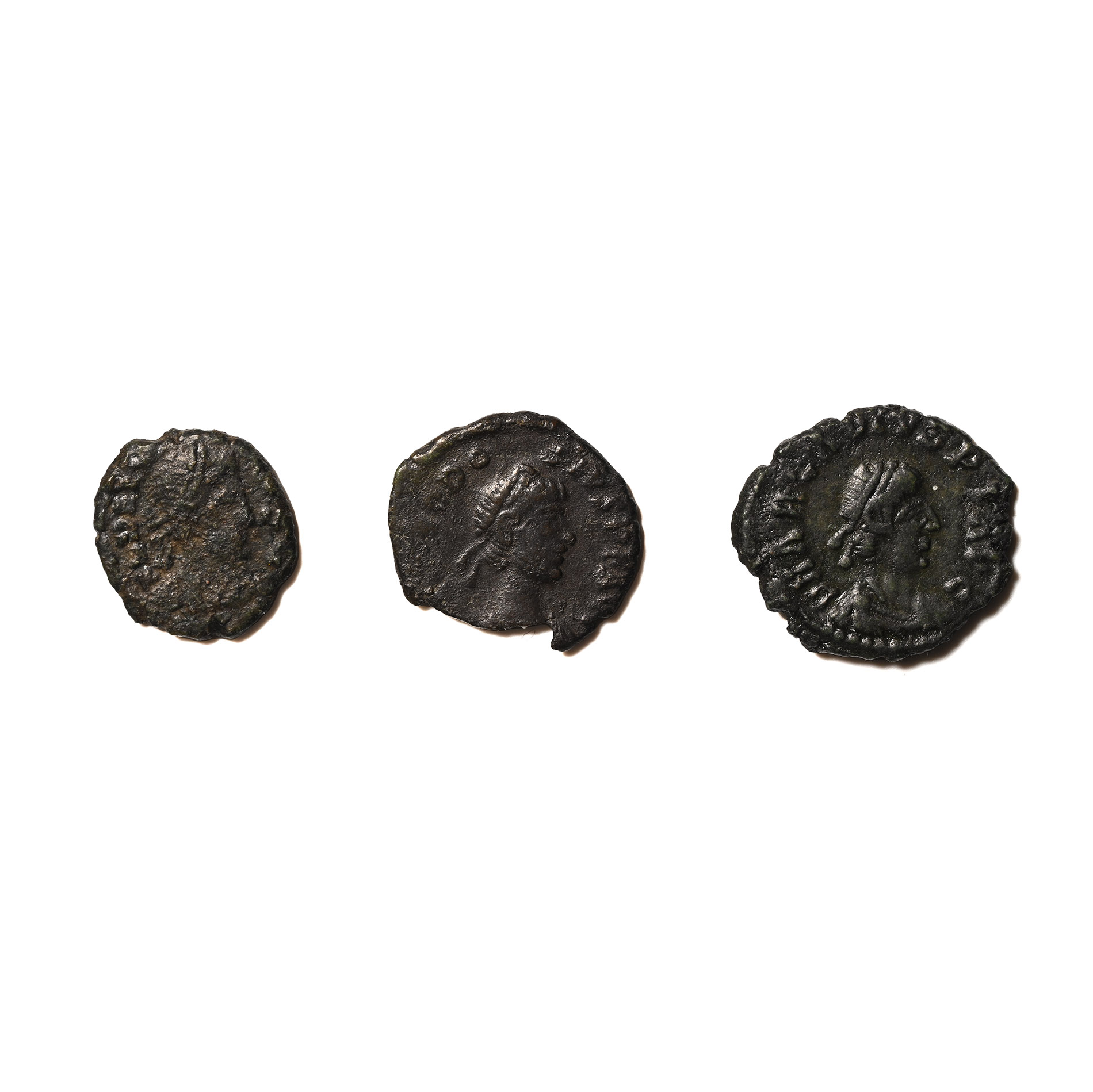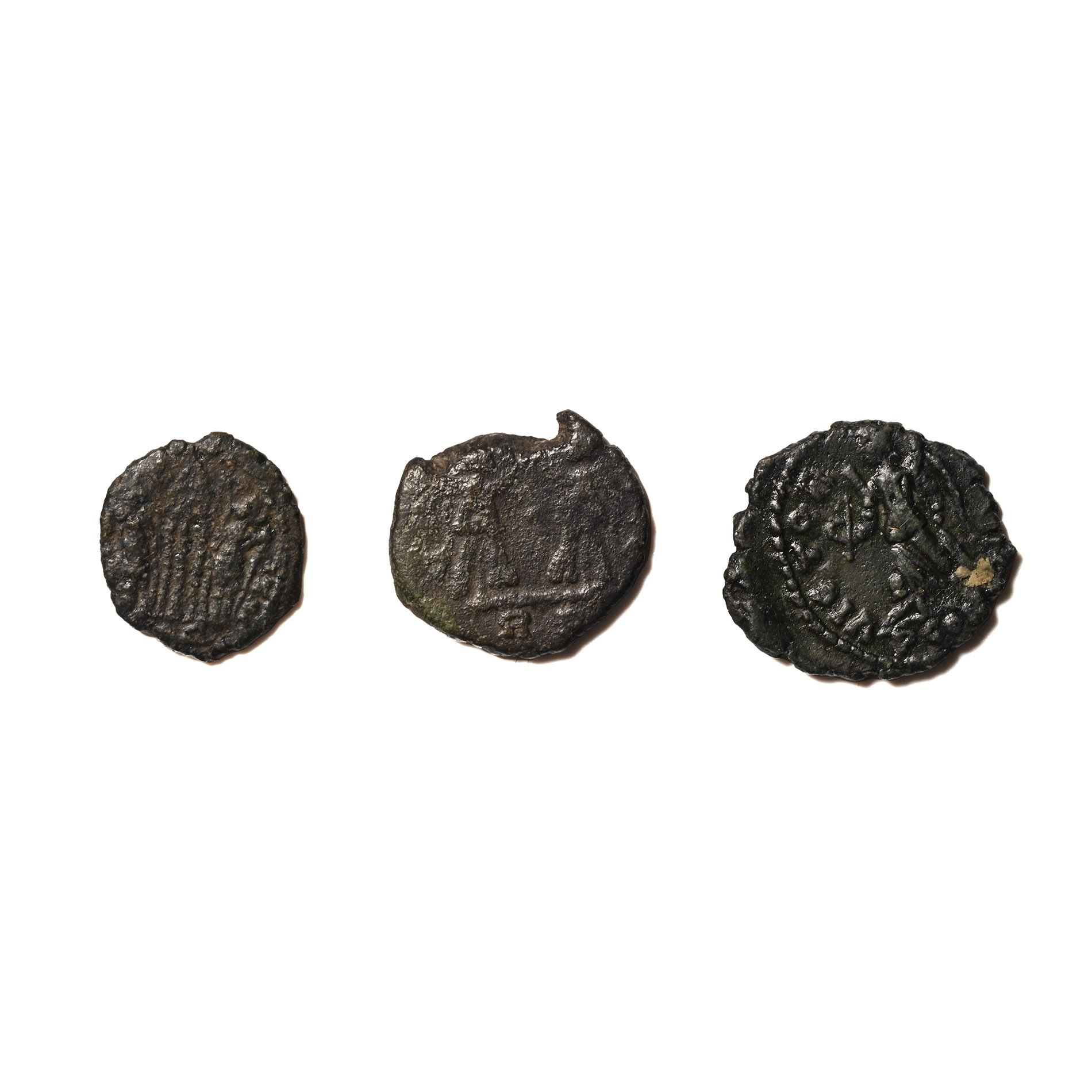 Group of bronze issues of Delmatius (AD 335-337), Theodosius I (AD 379-395), and Arcadius (AD 383-408). 2.86gr total, 10-14mm.
