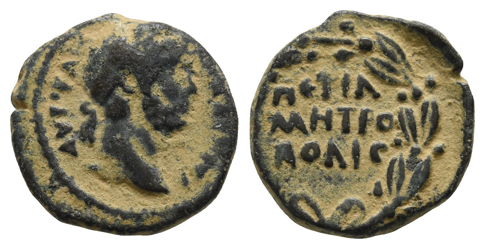 ΑΥΤ • ΚΑΙ[Ϲ ΤΡΑ] ΑΔΡΙ ϹЄΒ, laureate head to right / ΠЄΤΡΑ ΜΗΤΡΟΠΟΛΙϹ in three lines within wreath. RPC III 4103; Spijkerman 12; BMC 10. 3.49gr, 17mm, 12h.
