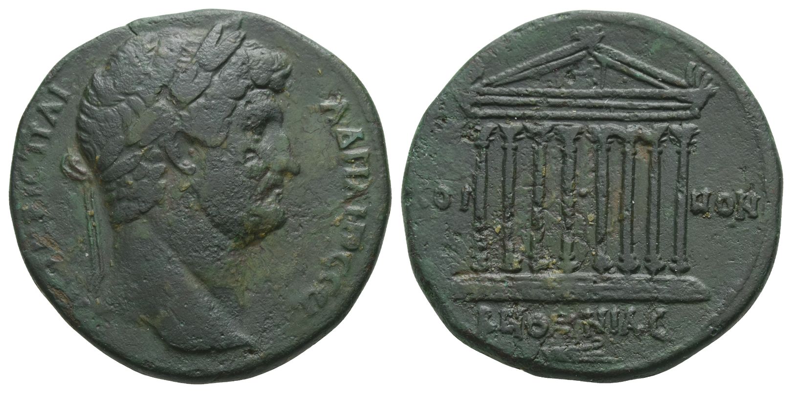 Uncertain Koinon mint, possibly Nicomedia. AVT KAIC TPAI AΔPIANOC CЄB, laureate head to right / KOI-NON BEIΘH(?)NIAC, octastyle temple on podium of two steps, pellet between middle columns, figure in the pediment; below, prow. Cf. RPC III, 1017; cf. RG 38. 20.93gr, 32mm, 6h.