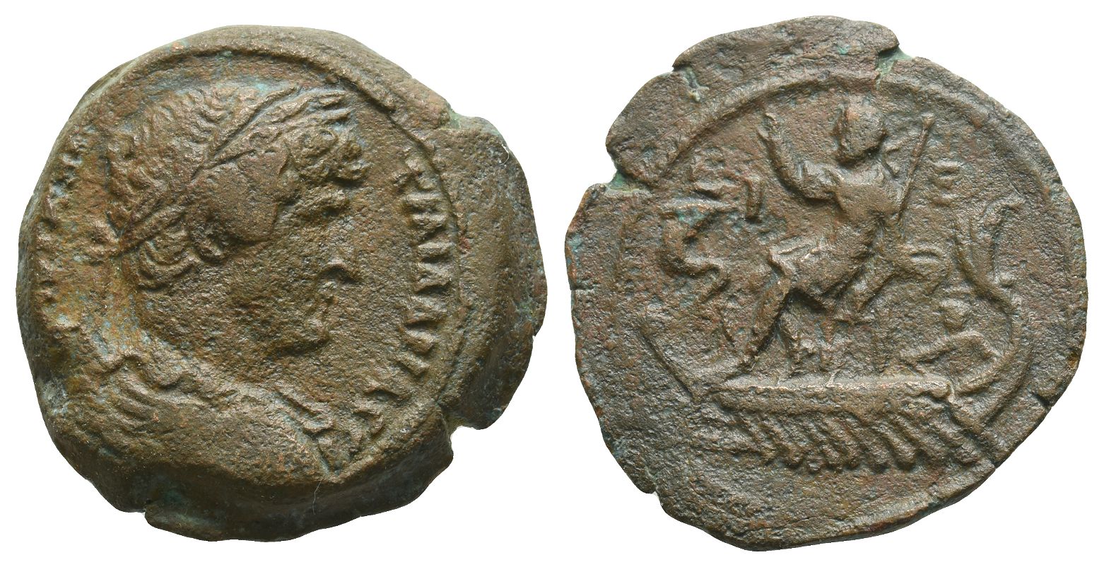 ΑVΤ ΚΑΙ ΤΡΑΙ ΑΔΡΙΑ CЄΒ, laureate, draped, and cuirassed bust to right, seen from rear / Hadrian, raising his right hand in salute and holding long sceptre, seated to left on galley sailing to left, steersman to right; mast with sail on front deck to left, L I-E (date) across upper field. RPC III 5785; Köln 1032; Dattari (Savio) 1582-3; K&G 32.513; Emmett 1127.15. 8.52gr, 25mm, 10h.