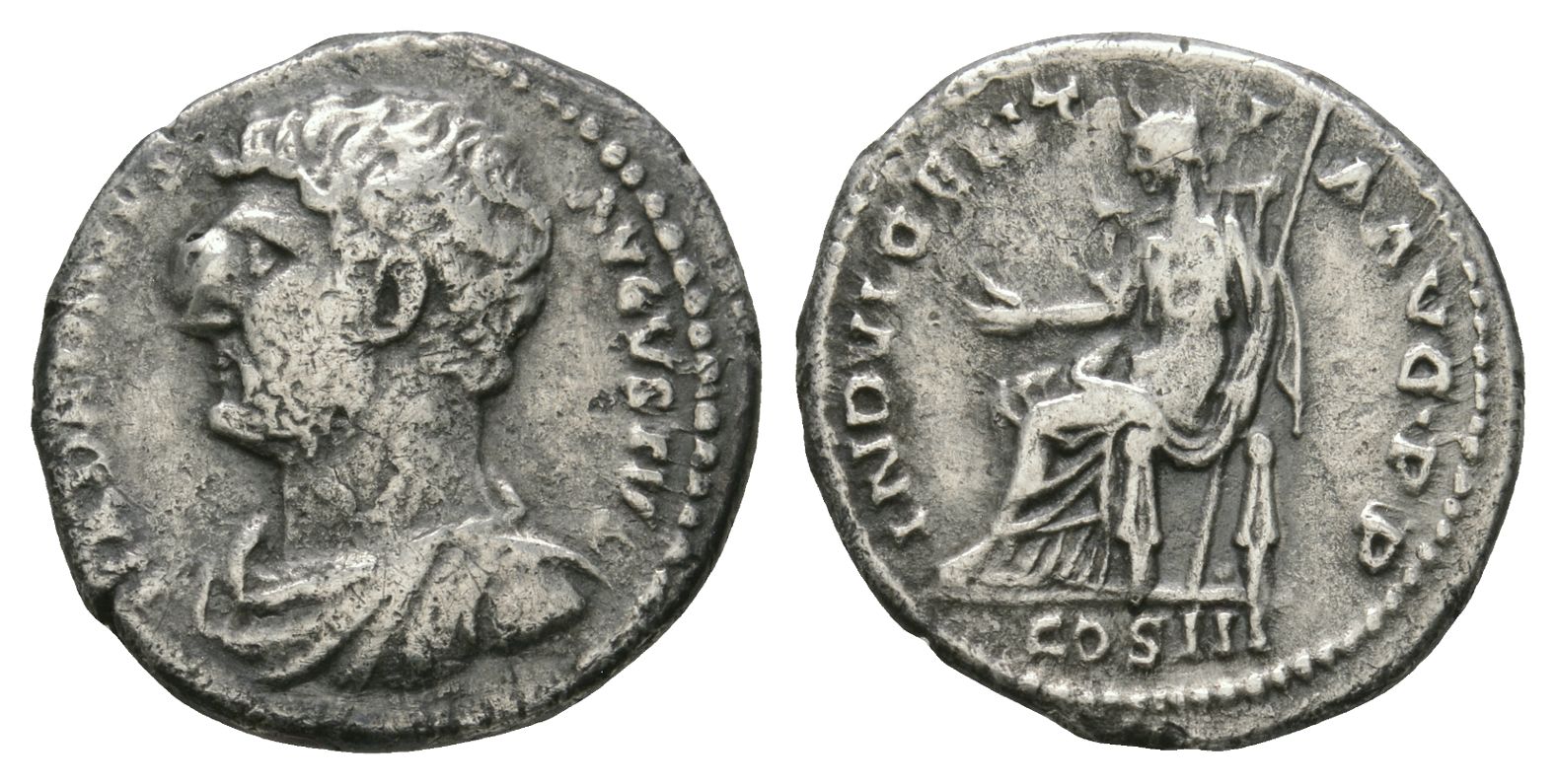 Rome mint; struck AD 129-130. HADRIANVS AVGVSTVS, bare-headed, draped and cuirassed bust to left / INDVLGENTIA AVG • P P, Indulgentia seated to left on throne, extending her right hand and holding sceptre in her left; COS III in exergue. RIC II.3 1023; Cohen -; BMC -. 1.97gr, 18mm, 6h