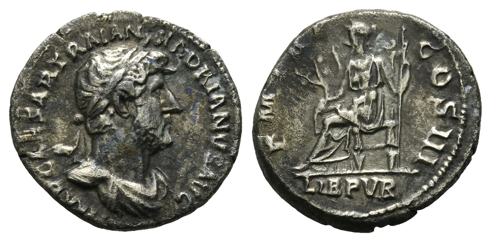 Rome mint; struck circa late AD 120-121. IMP CAESAR TRAIAN HADRIANVS AVG, laureate and draped bust of Hadrian to right / P M TR P COS III / Libertas seated to left on throne, holding branch in her right hand and sceptre in her left; LIB PVB in exergue. RIC II.3 367; BMC 286; Cohen 903. 3.43gr, 19mm, 6h.
